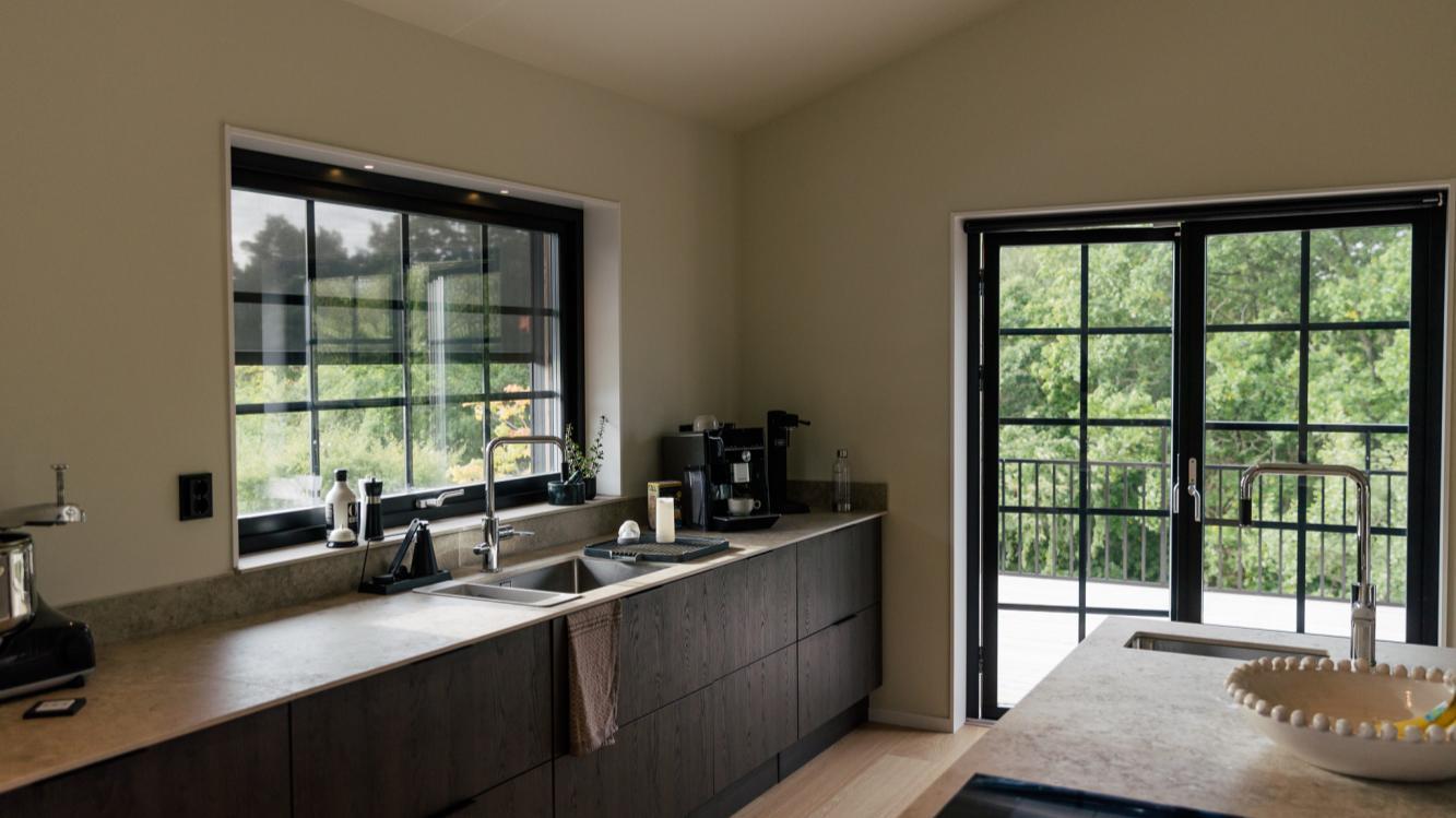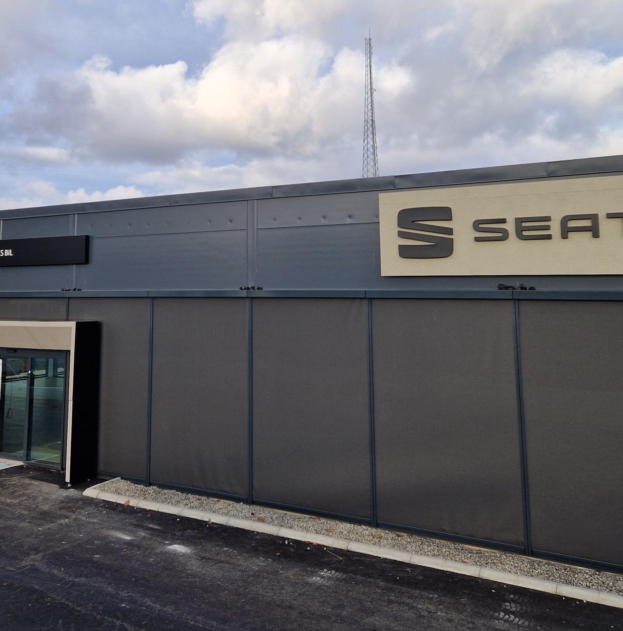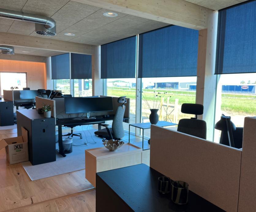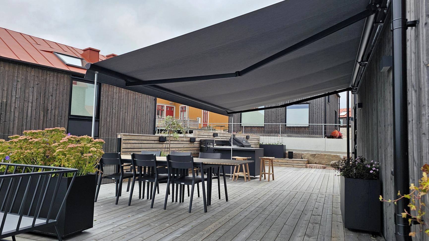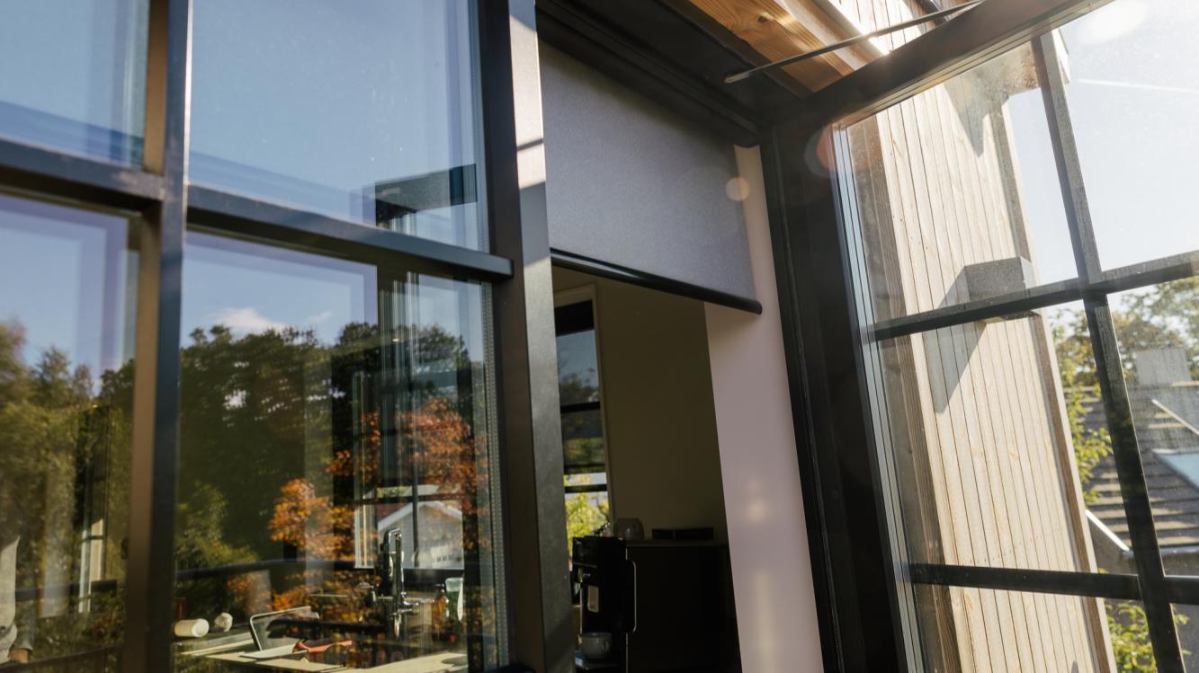Solskydd i samspel med helheten De dämpade screenvävarna samspelar elegant med den mörka träfasaden och skapar ett lågmält men kraftfullt uttryck. Solskyddet ger både visuell ro och behagliga temperaturer i rum med stora glaspartier.