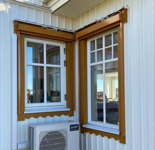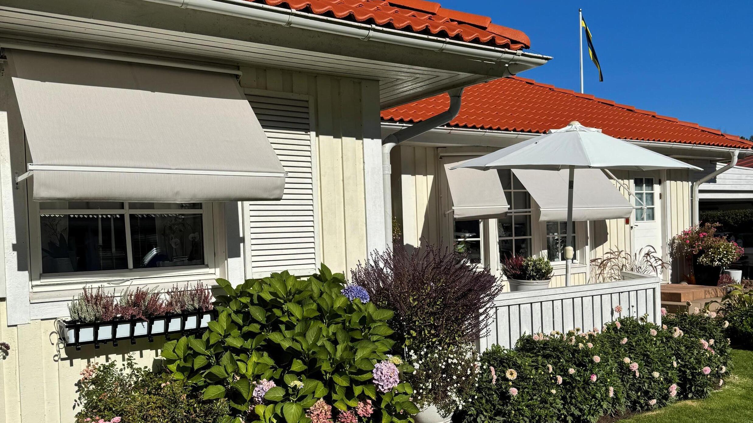 De ljusa markiserna förstärker husets traditionella karaktär och ger en mjuk, somrig skugga över fasaden. Ett enkelt, tidlöst solskydd som gör rummen ljusare och svalare under soliga dagar.