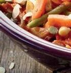 2. Verhit de olie en fruit hierin de ui, de knoflook en de kruiden. Voeg hierna de tomaatparten, abrikozen en alle Bonduelle groenten toe. Roer het geheel goed door en verhit tot serveertemperatuur.