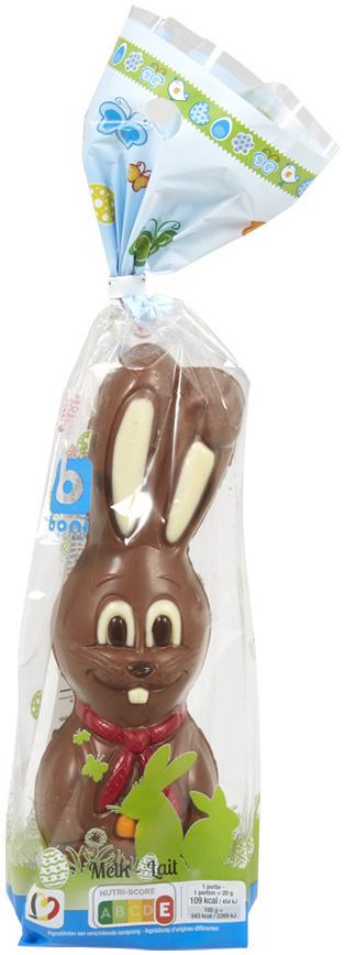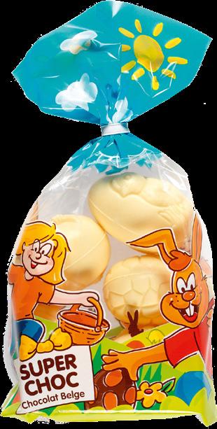 2 eieren van 7 cm (25 g): witte en melkchocolade, 1 paashaas van 15,5 cm (85 g): melkchocolade