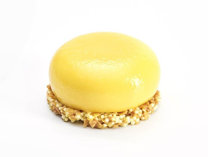 Une base croustillante de chocolat blanc et de fruits de la passion garnie d'une mousse aux fruits de la passion, d'une compote de mangue et d'un glaçage miroir aux fruits de la passion