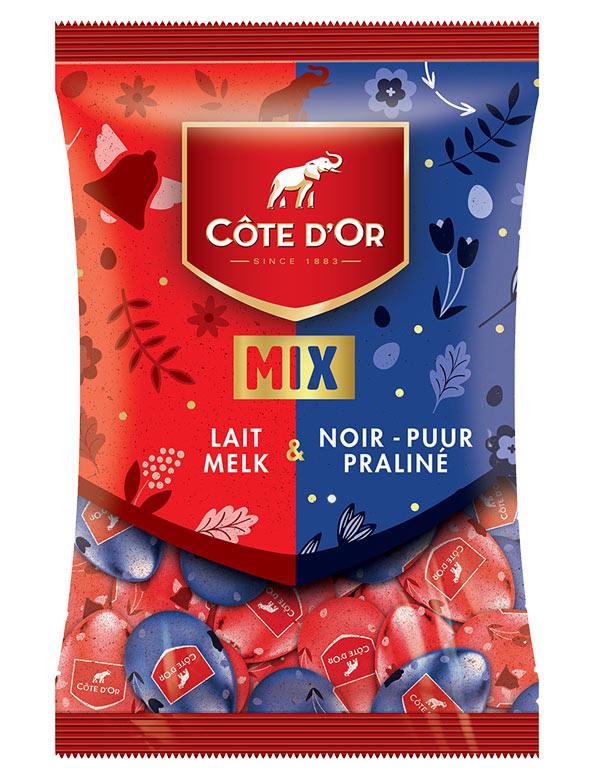 Or : lait praliné Mauve clair : blanc praliné Rouge : noir praliné