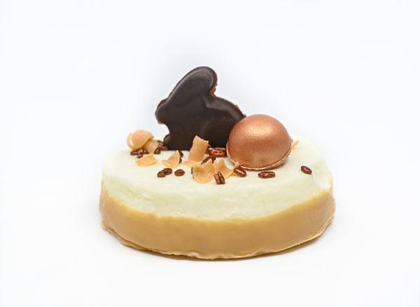 Gâteau rond individuel de mousse de crème fouettée au goût de caramel, à moitié enrobé de chocolat caramel, garni de décorations de Pâques en chocolat et de paillettes en sucre
