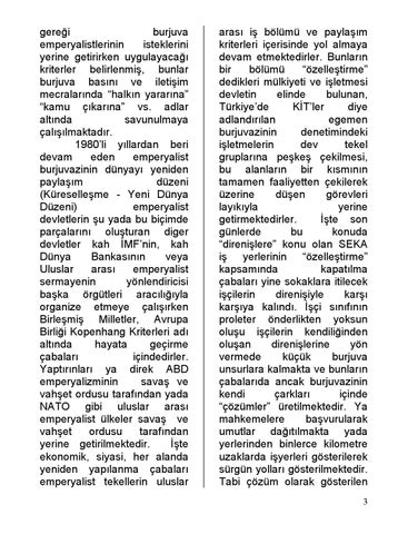 arası iş bölümü ve paylaşım kriterleri içerisinde yol almaya devam etmektedirler. Bunların bir bölümü “özelleştirme” dedikleri mülkiyeti ve işletmesi devletin elinde bulunan, Türkiye’de KİT’ler diye adlandırılan egemen burjuvazinin denetimindeki işletmelerin dev tekel gruplarına peşkeş çekilmesi, bu alanların bir kısmının tamamen faaliyetten çekilerek üzerine düşen görevleri layıkıyla yerine getirmektedirler. İşte son günlerde bu konuda “direnişlere” konu olan SEKA iş yerlerinin “özelleştirme” kapsamında kapatılma çabaları yine sokaklara itilecek işçilerin direnişiyle karşı karşıya kalındı. İşçi sınıfının proleter önderlikten yoksun oluşu işçilerin kendiliğinden oluşan direnişlerine yön vermede küçük burjuva unsurlara kalmakta ve bunların çabalarıda ancak burjuvazinin kendi çarkları içinde “çözümler” üretilmektedir. Ya mahkemelere başvurularak umutlar dağıtılmakta yada yerlerinden binlerce kilometre uzaklarda işyerleri gösterilerek sürgün yolları gösterilmektedir. Tabi çözüm olarak gösterilen 3