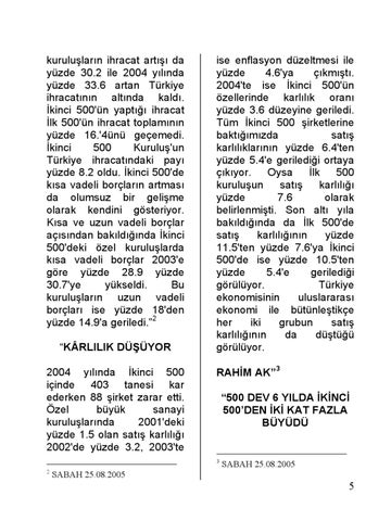 ise enflasyon düzeltmesi ile yüzde 4.6'ya çıkmıştı. 2004'te ise İkinci 500'ün özellerinde karlılık oranı yüzde 3.6 düzeyine geriledi. Tüm İkinci 500 şirketlerine baktığımızda satış karlılıklarının yüzde 6.4'ten yüzde 5.4'e gerilediği ortaya çıkıyor. Oysa İlk 500 kuruluşun satış karlılığı yüzde 7.6 olarak belirlenmişti. Son altı yıla bakıldığında da İlk 500'de satış karlılığının yüzde 11.5'ten yüzde 7.6'ya İkinci 500'de ise yüzde 10.5'ten yüzde 5.4'e gerilediği görülüyor. Türkiye ekonomisinin uluslararası ekonomi ile bütünleştikçe her iki grubun satış karlılığının da düştüğü görülüyor. RAHİM AK”3 “500 DEV 6 YILDA İKİNCİ 500’DEN İKİ KAT FAZLA BÜYÜDÜ