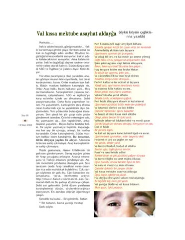 Val k›ssa mektube asayhat alday¤a Merhaba....; Irak’a sald›r› bafllad›, görüyorsundur... Halk› kurtarmaya gittiler güya. Savafl›n ad›na da Irak ›n özgürlü¤ü ad›n› verdiler. Böylece özgürlü¤ü kirleteceklerini san›yorlar. Irak’›n ad›n› kirleteceklerini san›yorlar. Ama kirletemiyorlar. Irak’›n özgürlü¤ü deyimi sadece onlar›n bir yalan› olarak kal›yor. Bütün dünya flimdi ABD ve ‹ngiltere’ye yalanc› diyor. Katil diyor.