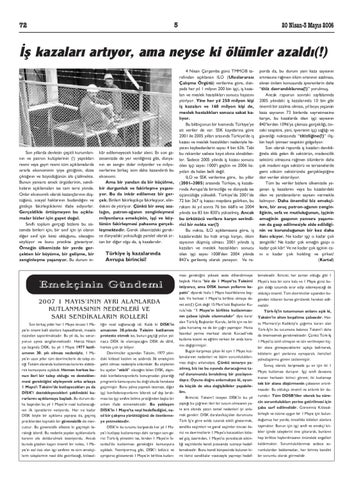 porda da, bu durum yani kaza say›s›n›n artmas›na ra¤men ölüm oran›n›n azalmas›, al›nan önlem konusunda iflverenlerin daha “titiz davrand›klar›na(!)” yorulmufl. Ancak raporun sonraki sayfalar›nda 2005 y›l›ndaki ifl kazalar›nda 10 bin gibi önemli bir azalma olmas›, y›l boyu yaflanan kaza say›s›n›n 73 binlerde seyretmesine karfl›n, bu kazalarda ölen iflçi say›s›n›n 843’lerden 1096’ya ç›kmas› gerçekli¤i, önceki tespitini, yani, iflverenin iflçi sa¤l›¤› ve güvenli¤i noktas›nda “titizli¤ine(!)” iliflkin hayli iyimser tespitini gölgeliyor. Son olarak raporda ifl kazalar› denildi¤inde akla gelen ilk sektörün, madencilik sektörü olmas›na ra¤men ölümlerin daha çok madeni eflya sektörü ve tersanelerde gemi söküm sektöründe gerçekleflti¤ine dair veriler aktar›l›yor. Tüm bu veriler bizlere ülkemizde yaflanan ifl kazalar›n› veya bu kazalardaki ölen ve yaralananlar›n say›s›n› vermekle kalm›yor. Daha önemlisi biz emekçilere, bir avuç patron-a¤an›n zenginli¤inin, sefa ve mutlulu¤unun, iflçinin eme¤inin gasp›n›n yan›s›ra yaflam›n›n da gasp edilmesiyle elde edildi¤inin ve korundu¤unun bir kez daha ilan› oluyor. Ne kadar iflçi o kadar çok zenginlik! Ne kadar çok eme¤in gasp› o kadar çok kâr! Ve ne kadar çok iflçinin can› o kadar çok holding ve flirket! (Kartal)