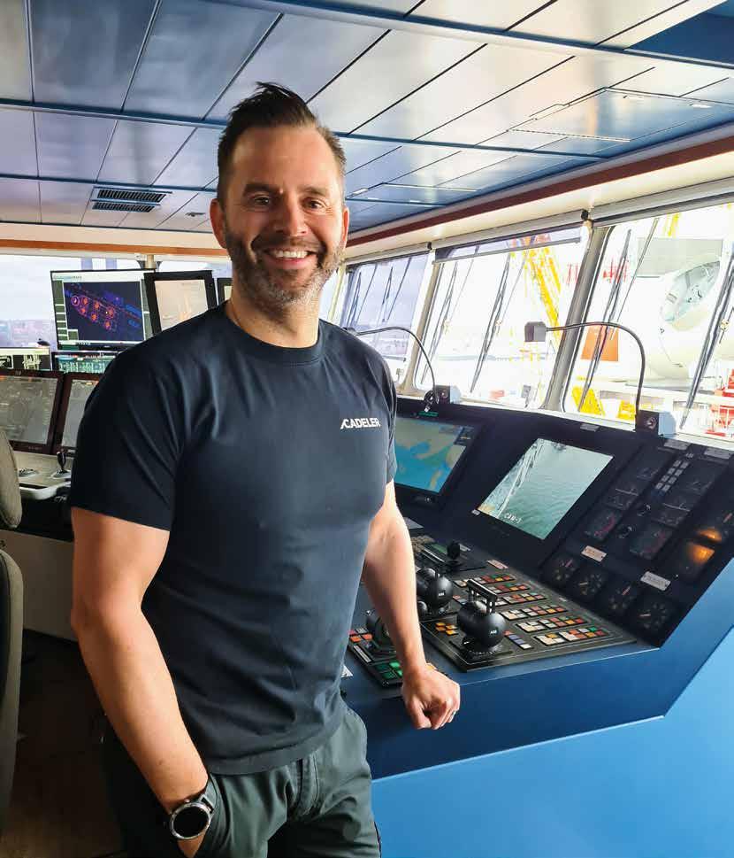 Det store offshore supply skib tager gæstfrit i mod. Fire etager oppe fra det primære dæk er den engelske kaptajn Edward Barett netop færdig med et møde. Han blev kadet i 1997, bestod skibsførereksamen i 2012, hvorefter han blev kaptajn.