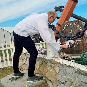 Efter jubilæumsgudstjenesten gik alle deltagere ud til mindesmærket for de omkomne fiskere, fangere og søfolk, der aldrig kom hjem fra havet. Her nedlagde sømandsmissionær Karsten Hald Jacobsen en krans på vegne af Sømandsmissionen.