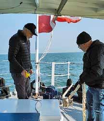 Sømandsmissionær Finn Løvlund var ombord på Wilson Rotter dam, hvor de lige havde lastet vindmølledele, der skulle fragtes til Sverige. De fik en invitation til Esbjerg Sømandscenter, Waves og en påskehilsen, som de blev meget glade for. Det førte til en læn- gere snak med kaptajnen Roman Steshenko om påske og især om at være afhængig af Gud i livet, ikke mindst på havet på et skib. Roman (i grå skjorte) er russer ligesom resten af besætningen. Han tog også imod andagtsbogen Waves of value. Han og besæt- ningen havde allerede bibler.
