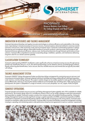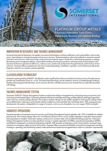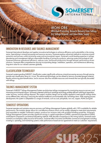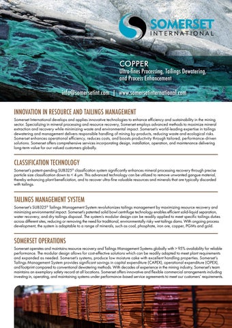 At Somerset International we are at the forefront of advanced processing solutions in ultrafine particle treatment across the mining industry. With leading-edge technology, we provide a fundamental change in Resource Recovery, Processing Enhancement, and Tailings Management. Resource Recovery maximizes the capturing of valuable products that were previously discarded in the tailings waste. Processing Enhancement ultrafine separation technology classifies sub 44 μm (SUB325® mesh) materials by particle size to enable more efficient beneficiation. Tailings Management offers our key dewatering system that delivers dry, handleable solids waste to reduce reliance on tailings storage facility, while also recovering clean, recyclable water.