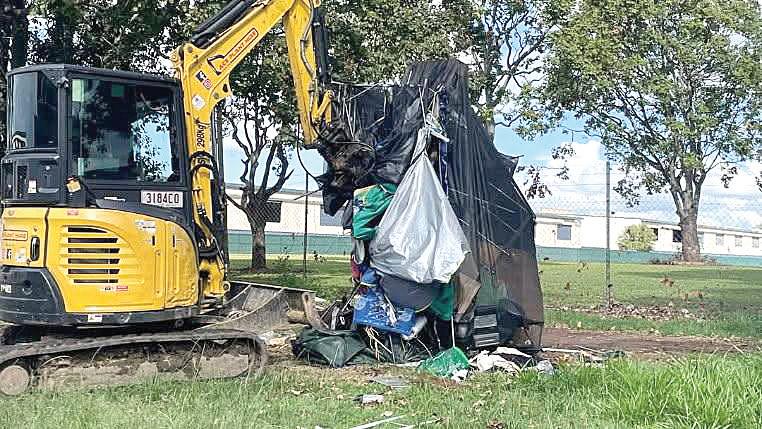 CAMP sites were torn down and removed with an excavator by Moreton Bay Council last week at Eddie Hyland Park (EHP) as armed police officers looked on.