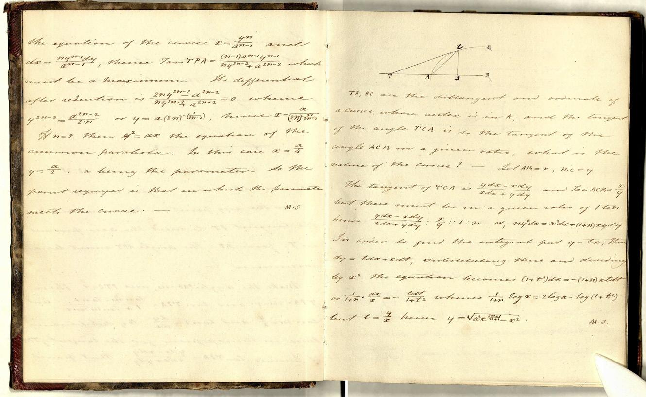 Even though she spent the latter thirty years of her life moving between numerous Italian towns and cities, Mary Somerville amassed a significant collection of notebooks, manuscripts, and letters which bear witness to her personal and scientific lives. Her notebooks include drafts of solutions to mathematical puzzles found in periodicals; diary entries from her first European travels, especially her time in Paris; and notes taken during the preparation of her books. Her manuscripts contain drafts of two mathematical texts which were ultimately never published, alongside early versions of her autobiography which was posthumously released in 1873 as The Personal Recollections, from early life to old age, of Mary Somerville.