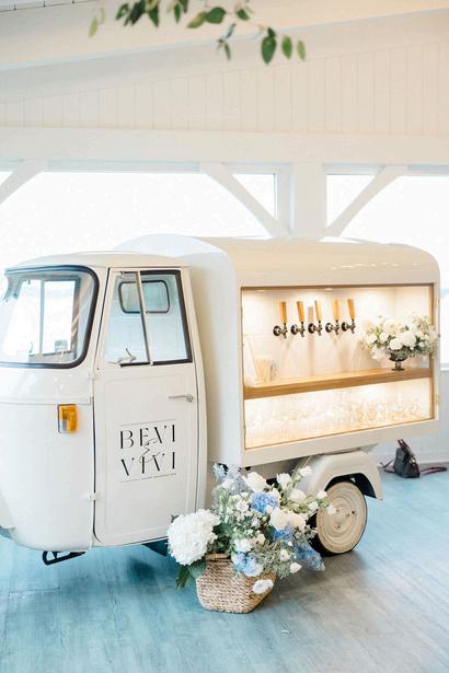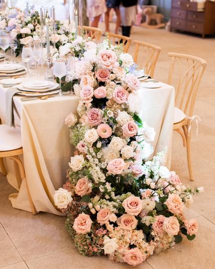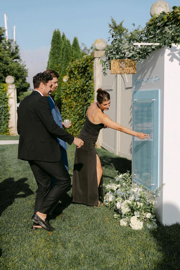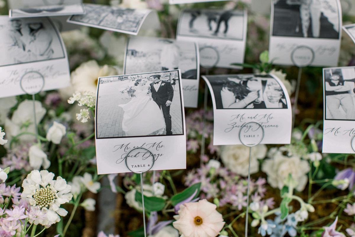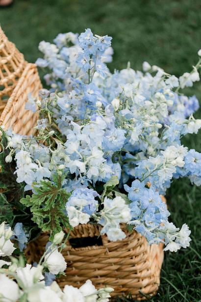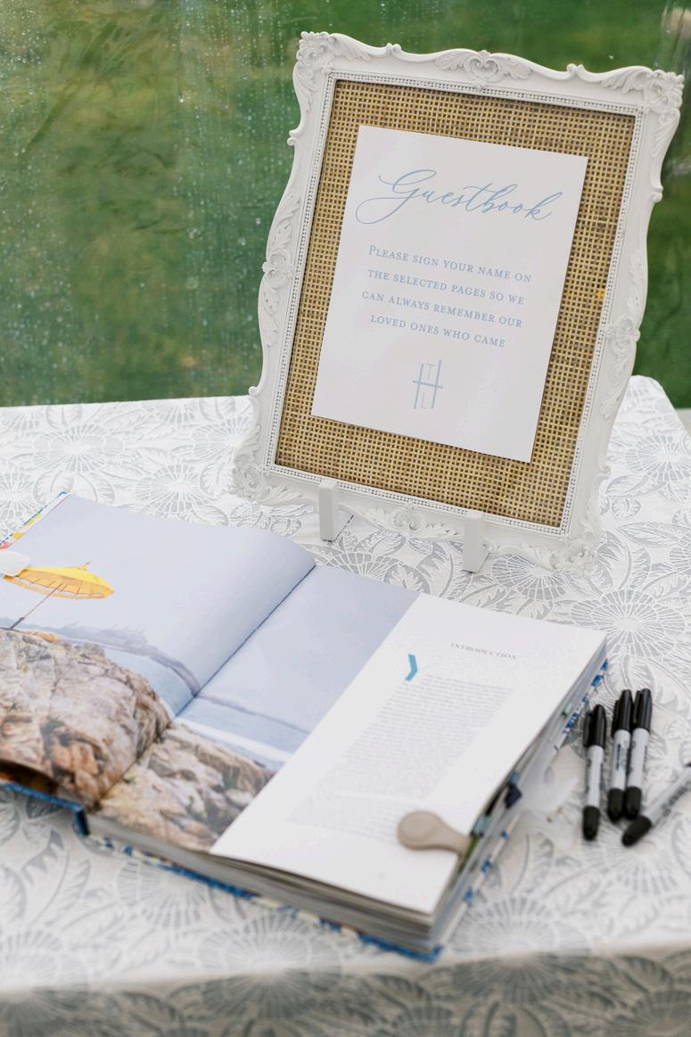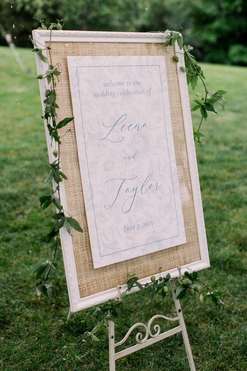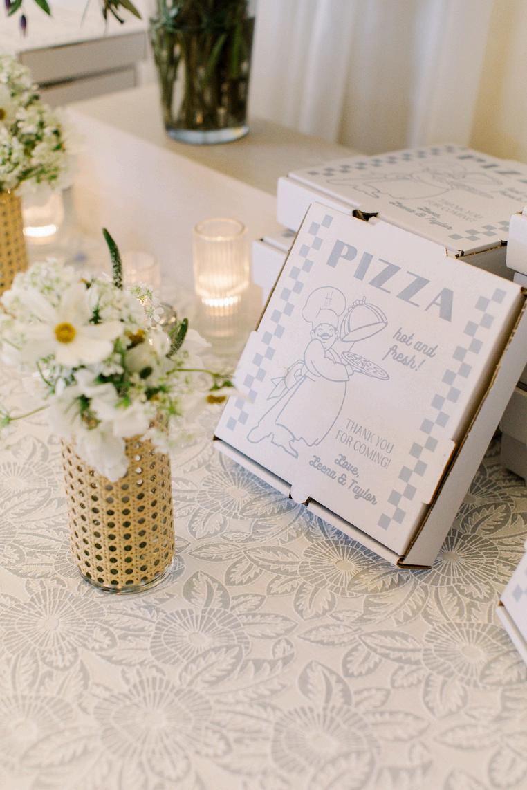 Leena and Taylor’s celebration blended soft blues and pinks with a whimsical and coastal touch Rattan textures paired with ornate details and an abundance of florals created a space that felt both elevated and inviting Our favorite detail was their Polaroid style escort display, featuring photos of each guest within a bed of flowers and added a personal, joyful touch to cocktail hour The details went until the very last dance with custom pizza boxes for guests to enjoy Planning by AMC Weddings, florals by Stoneblossom and photos by Krista Jean Photography