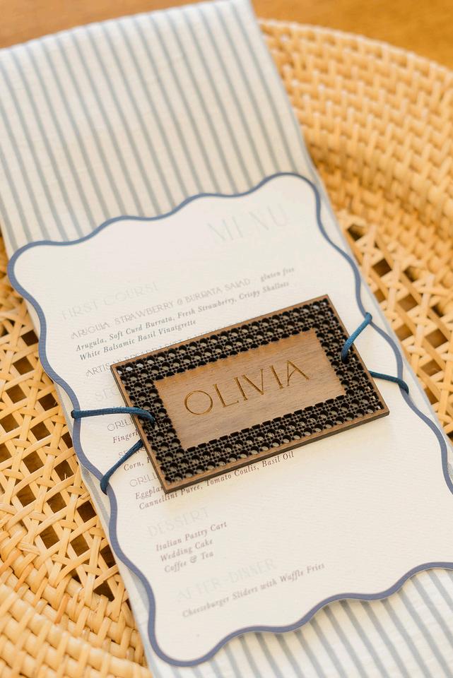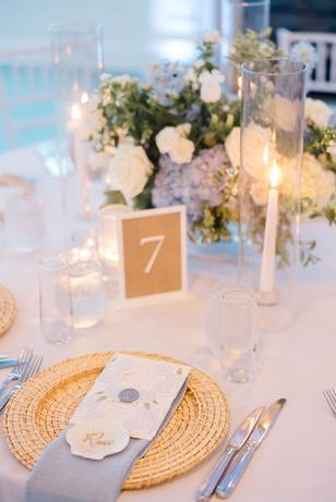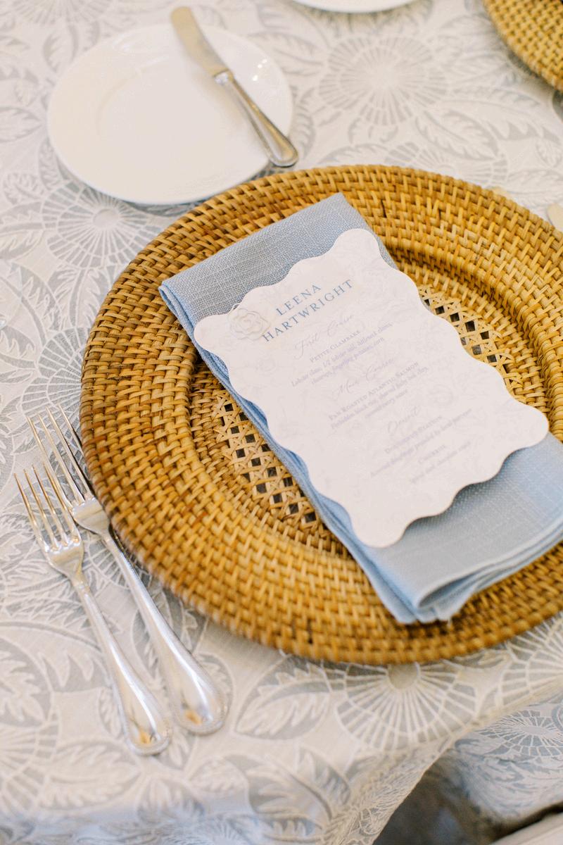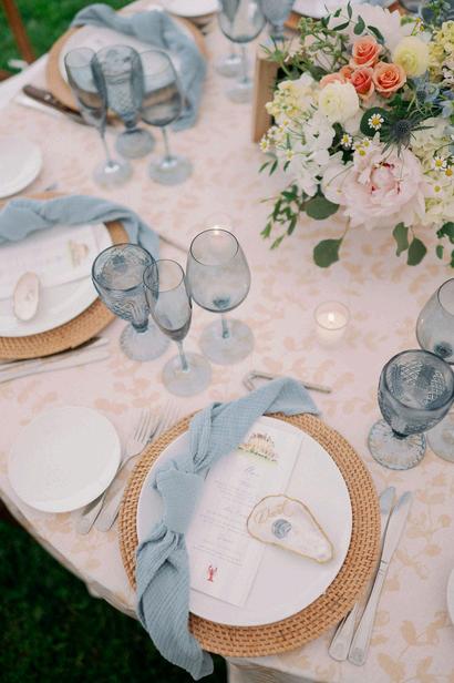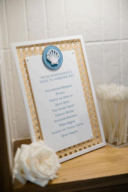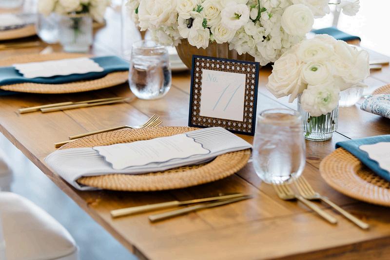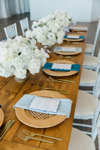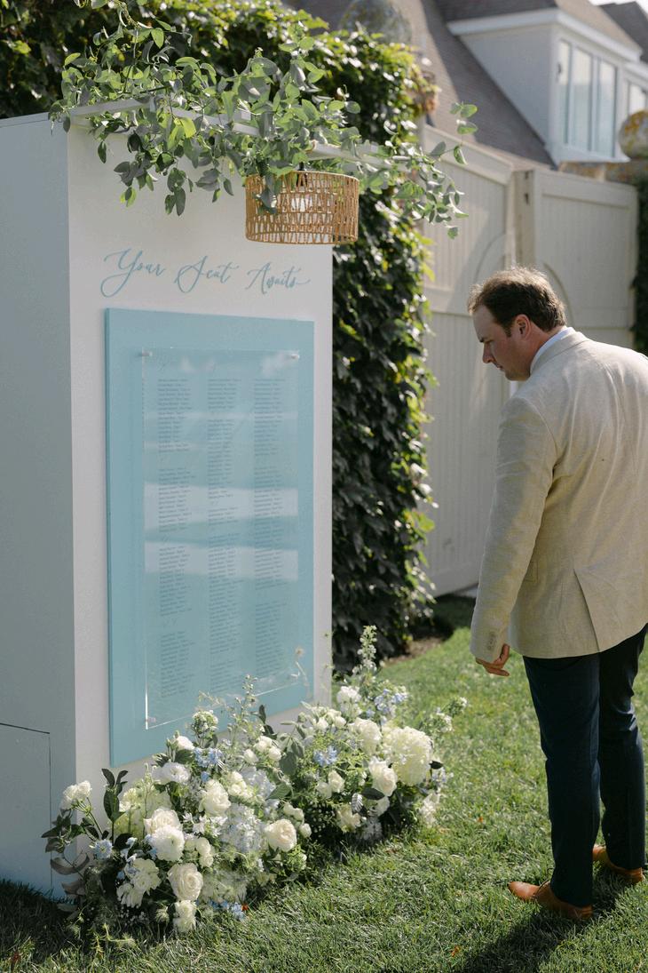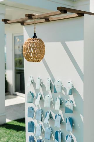 Cassidy and Colin’s Belle Mer wedding embraced a fresh, airy palette of soft blues and crisp whites Their custom monogram appeared throughout the design, paired with a thoughtfully styled seating chart beneath a rattan light dant florals added charm and personality, creating a light, elegant, and by MK Your Dream Day, with florals by Floral Fixation, and orden Photography