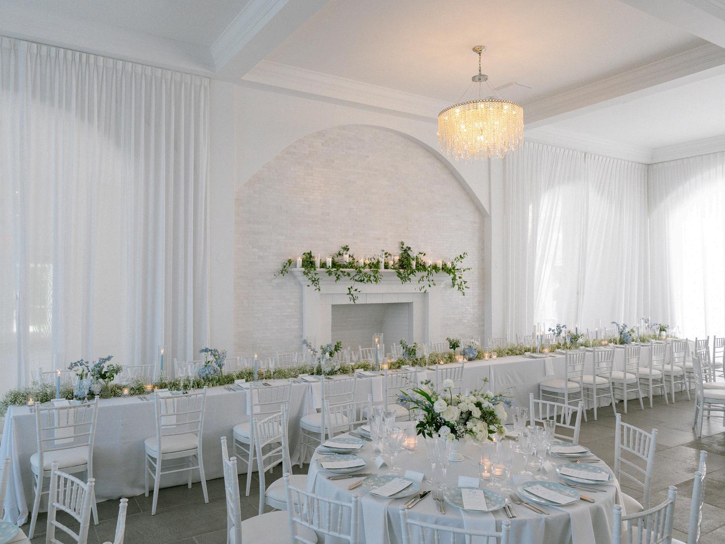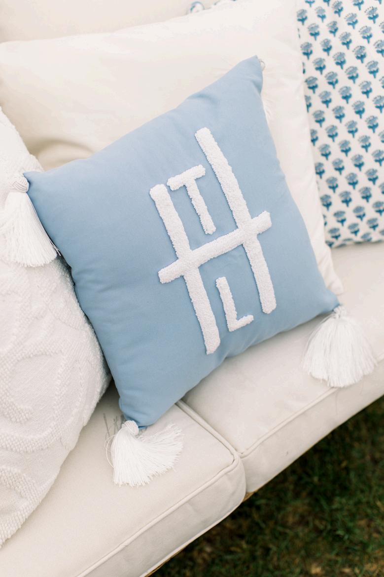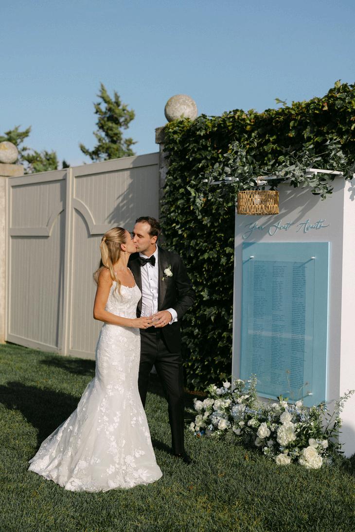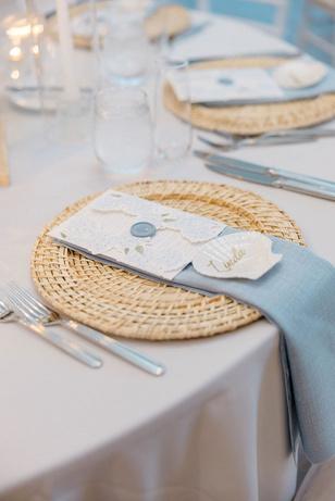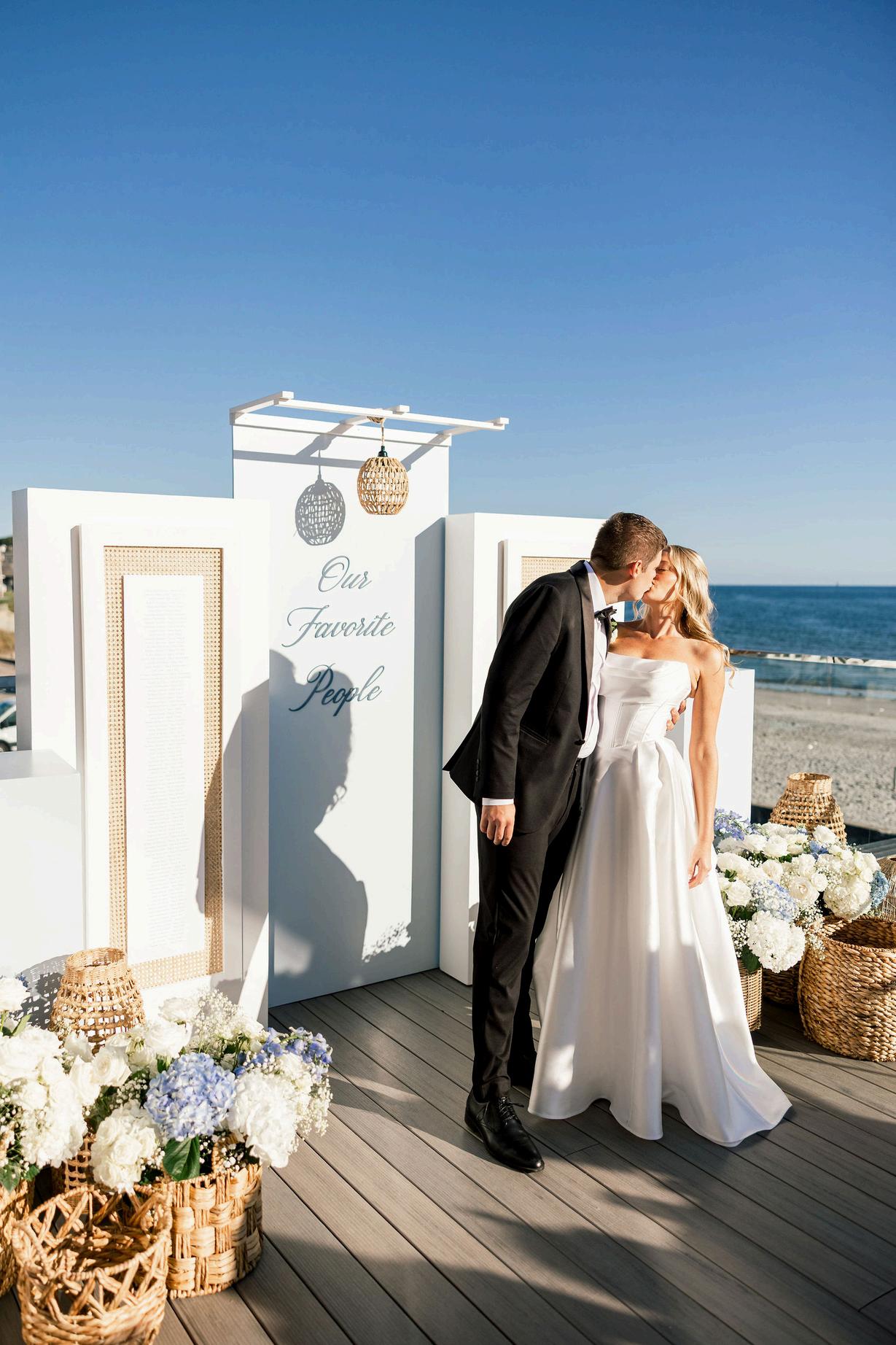 Cassidy and Colin’s Belle Mer wedding embraced a fresh, airy palette of soft blues and crisp whites Their custom monogram appeared throughout the design, paired with a thoughtfully styled seating chart beneath a rattan light dant florals added charm and personality, creating a light, elegant, and by MK Your Dream Day, with florals by Floral Fixation, and orden Photography