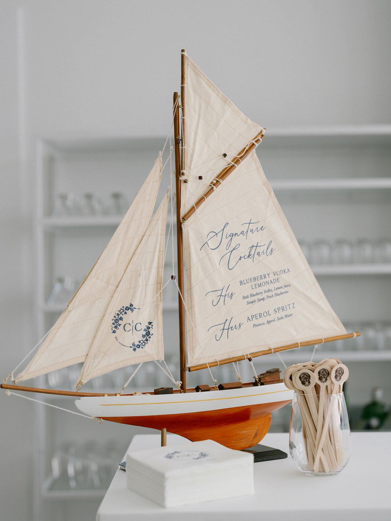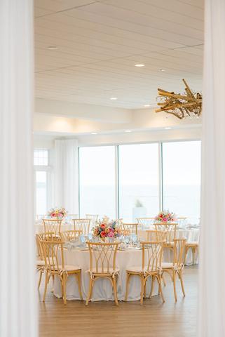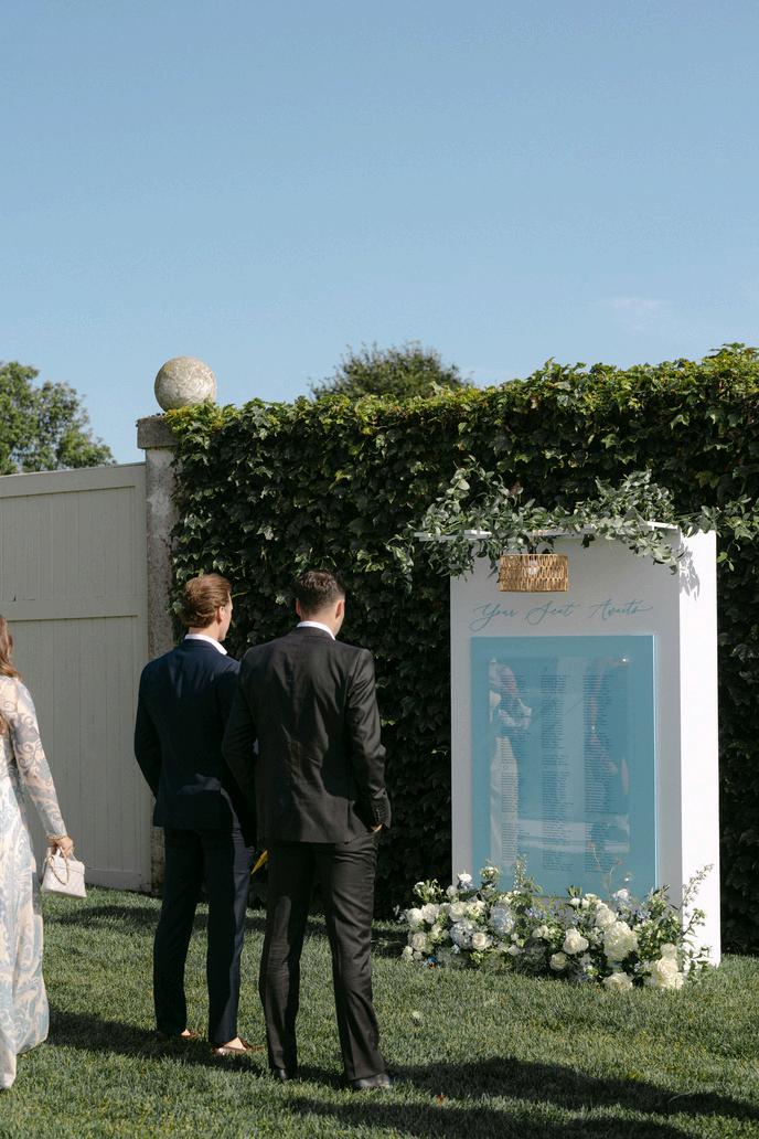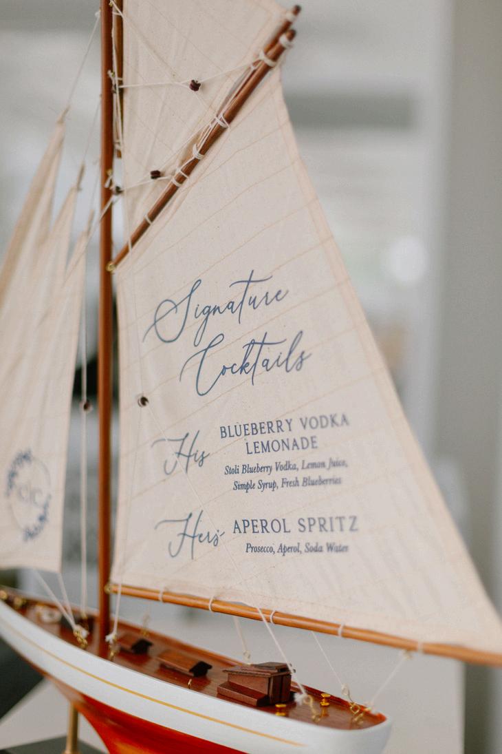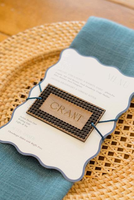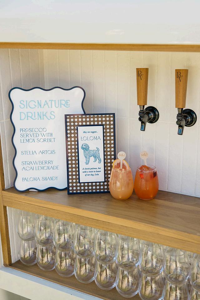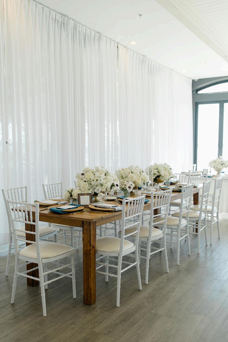 Cassidy and Colin’s Belle Mer wedding embraced a fresh, airy palette of soft blues and crisp whites Their custom monogram appeared throughout the design, paired with a thoughtfully styled seating chart beneath a rattan light dant florals added charm and personality, creating a light, elegant, and by MK Your Dream Day, with florals by Floral Fixation, and orden Photography
