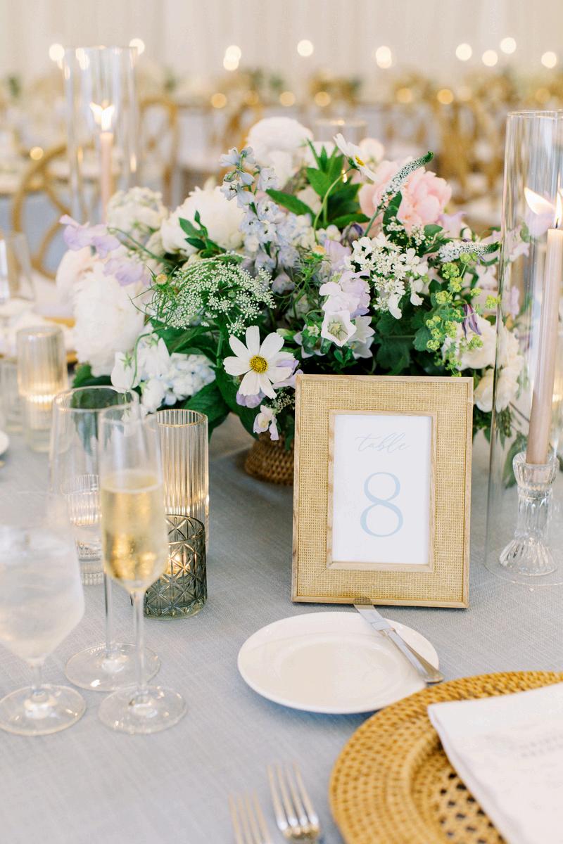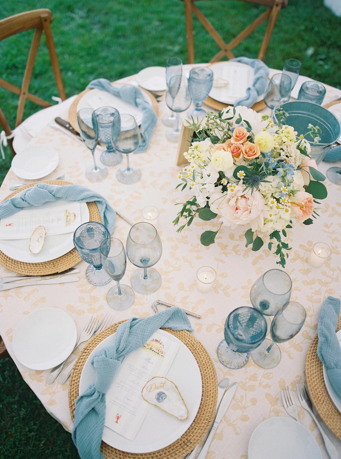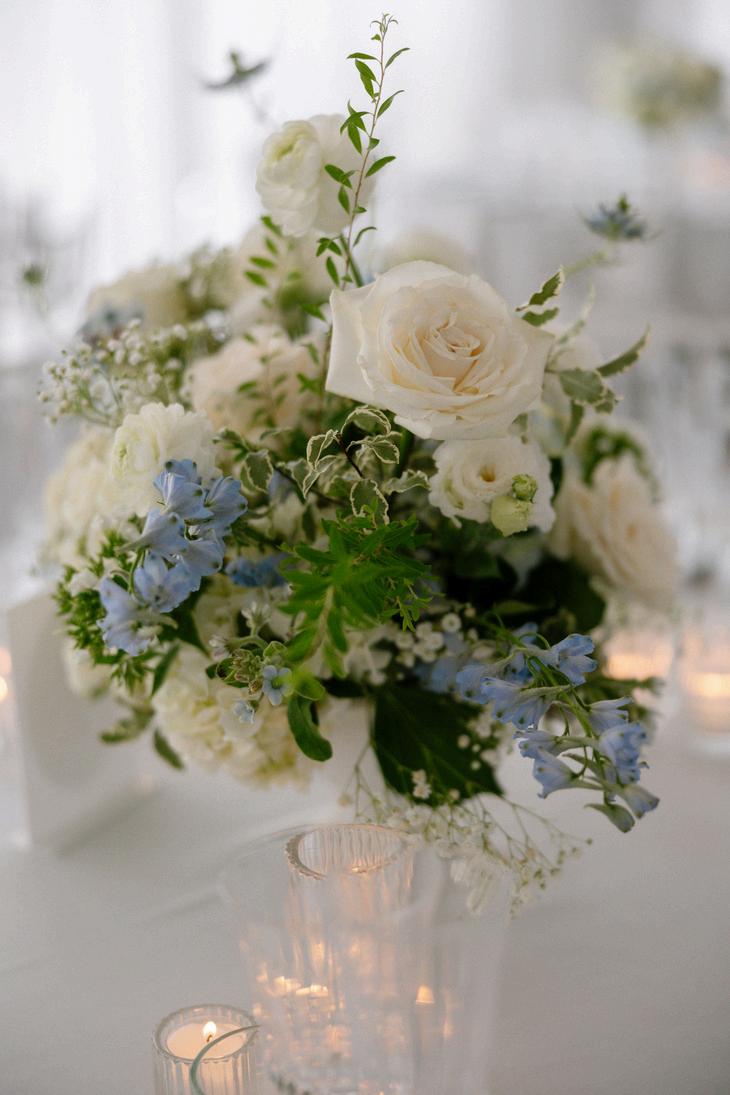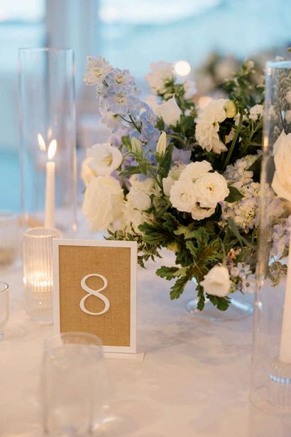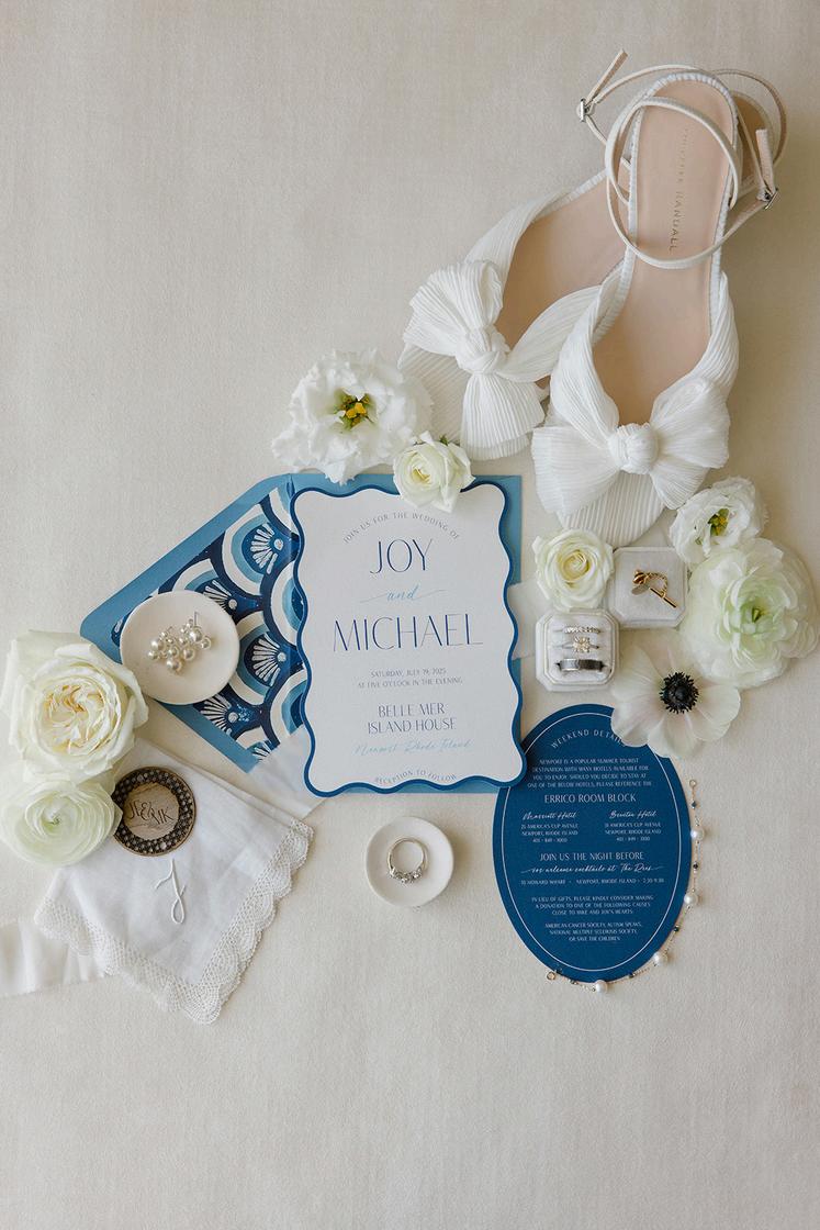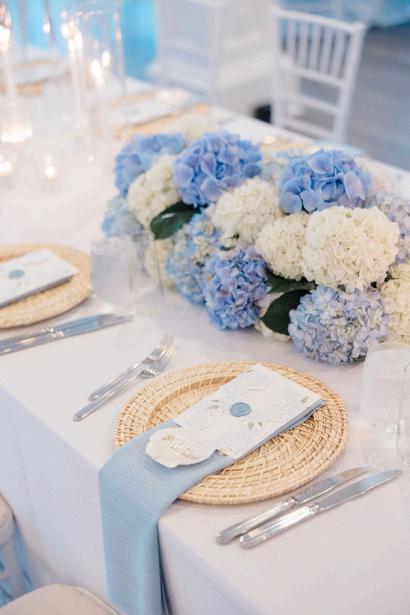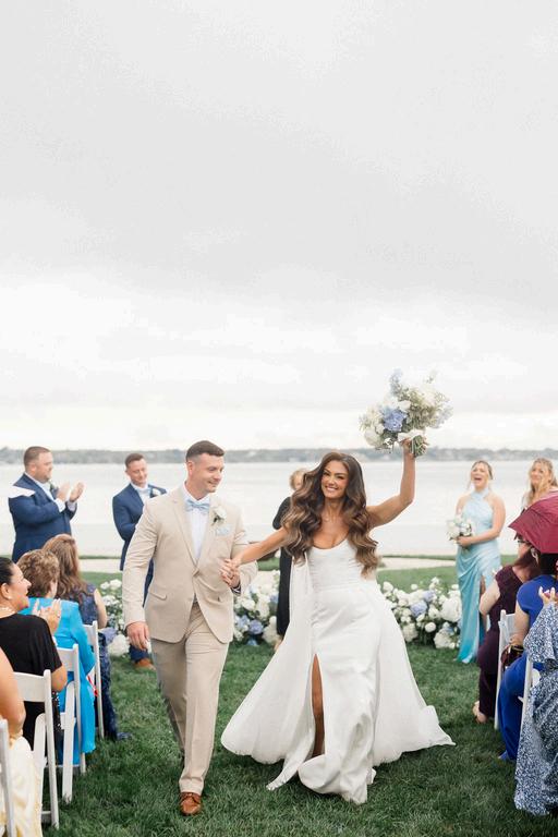 Taylor and Terrence’s wedding captured a quintessential New England summer through a palette of soft blues and whites layered with coastal textures. Rattan accents and abundant hydrangeas set the tone, while custom hydrangea-wrapped menus and subtle pearl details added a touch of coastal glam The overall design felt chic, fresh, and didn’t miss a single detail Florals by Floral Fixation and photos by Coli Michael Photography