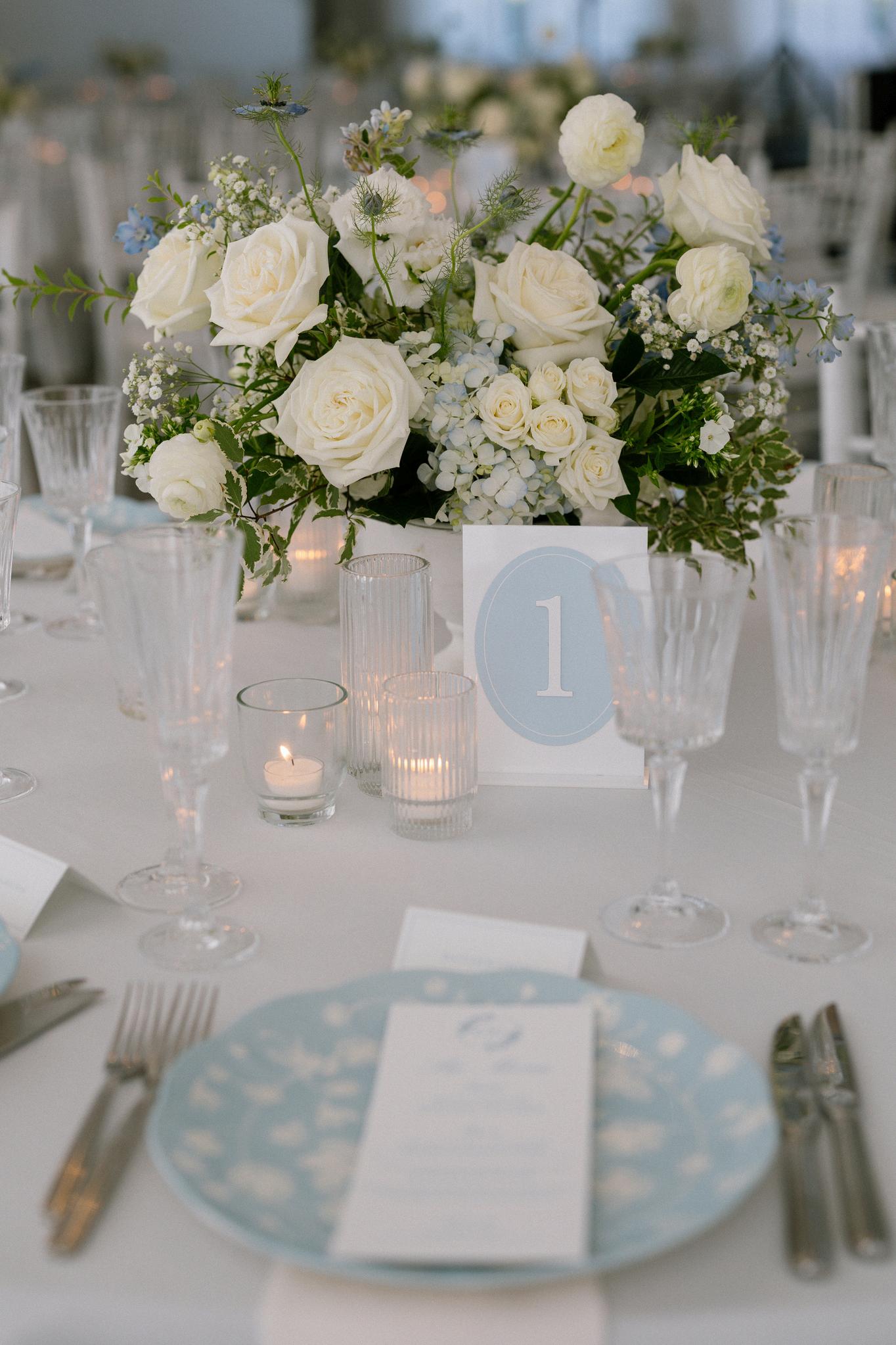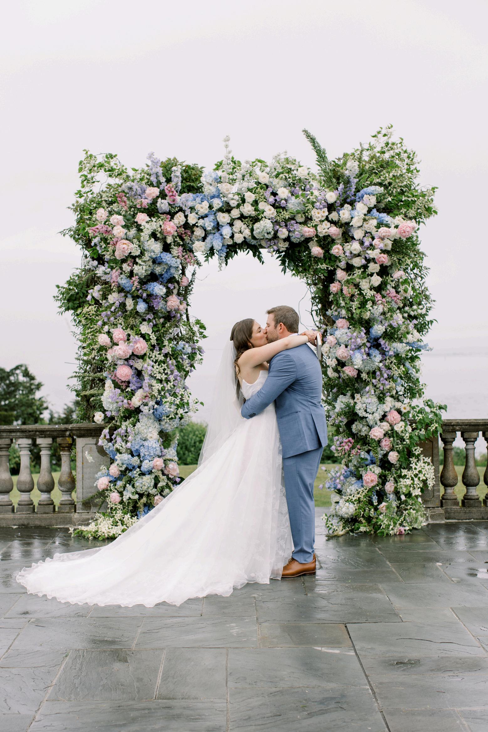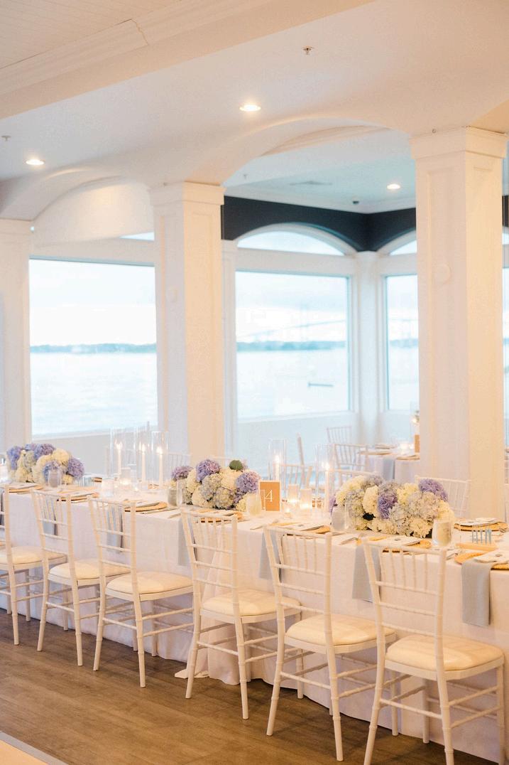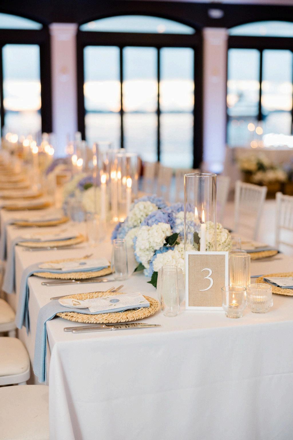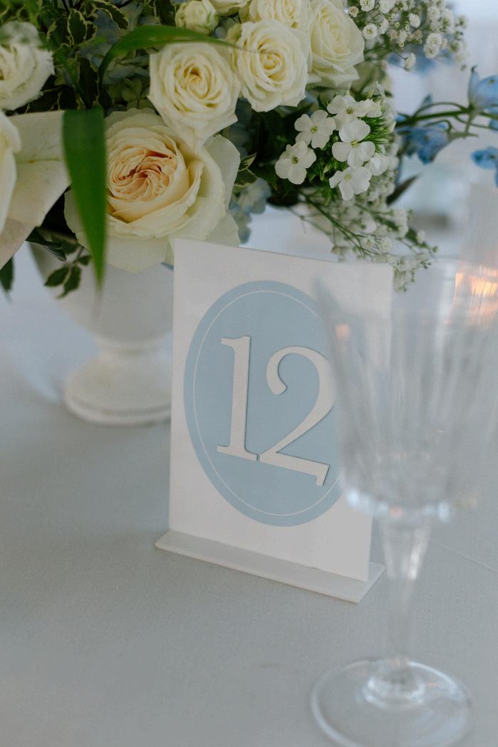 Taylor and Terrence’s wedding captured a quintessential New England summer through a palette of soft blues and whites layered with coastal textures. Rattan accents and abundant hydrangeas set the tone, while custom hydrangea-wrapped menus and subtle pearl details added a touch of coastal glam The overall design felt chic, fresh, and didn’t miss a single detail Florals by Floral Fixation and photos by Coli Michael Photography