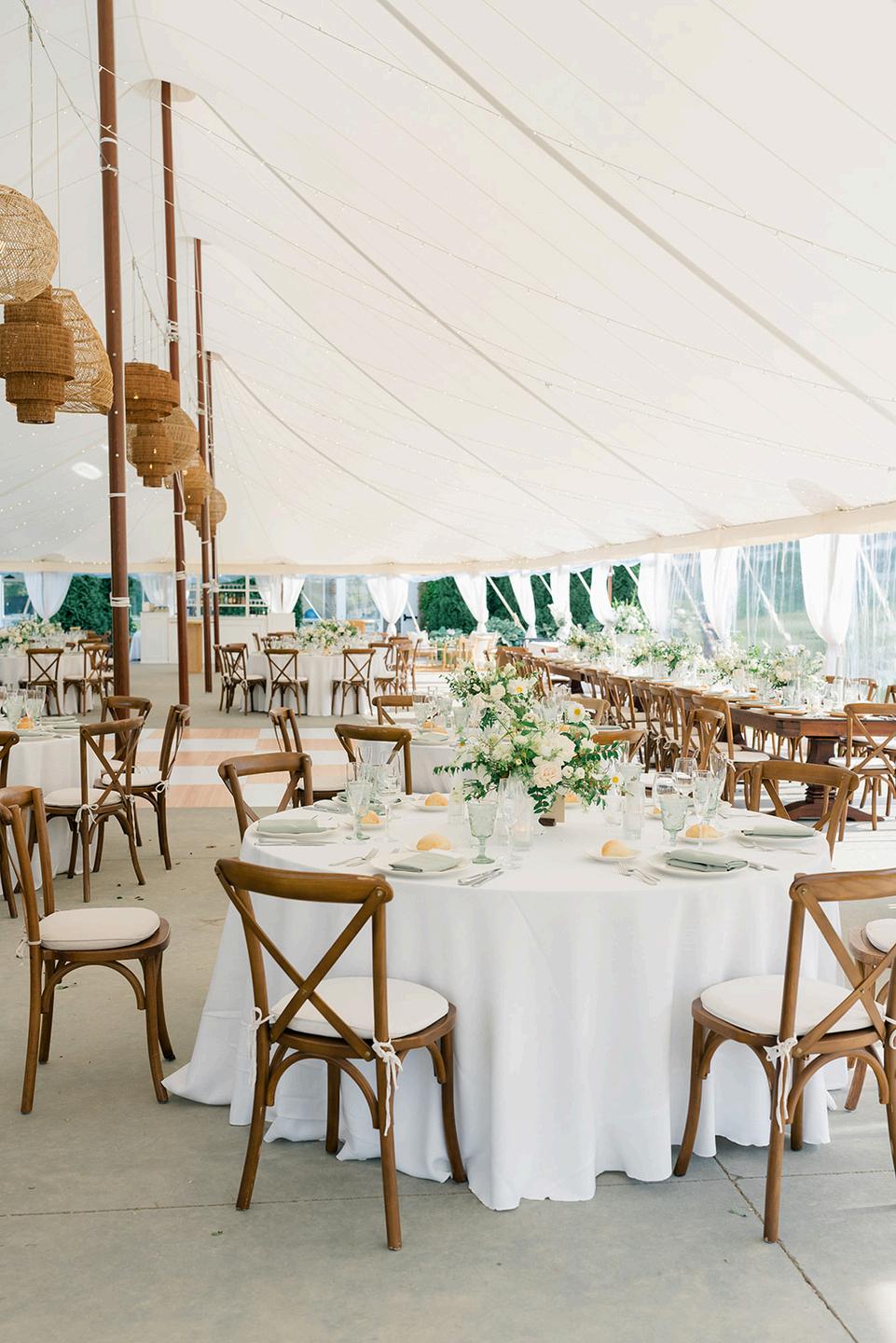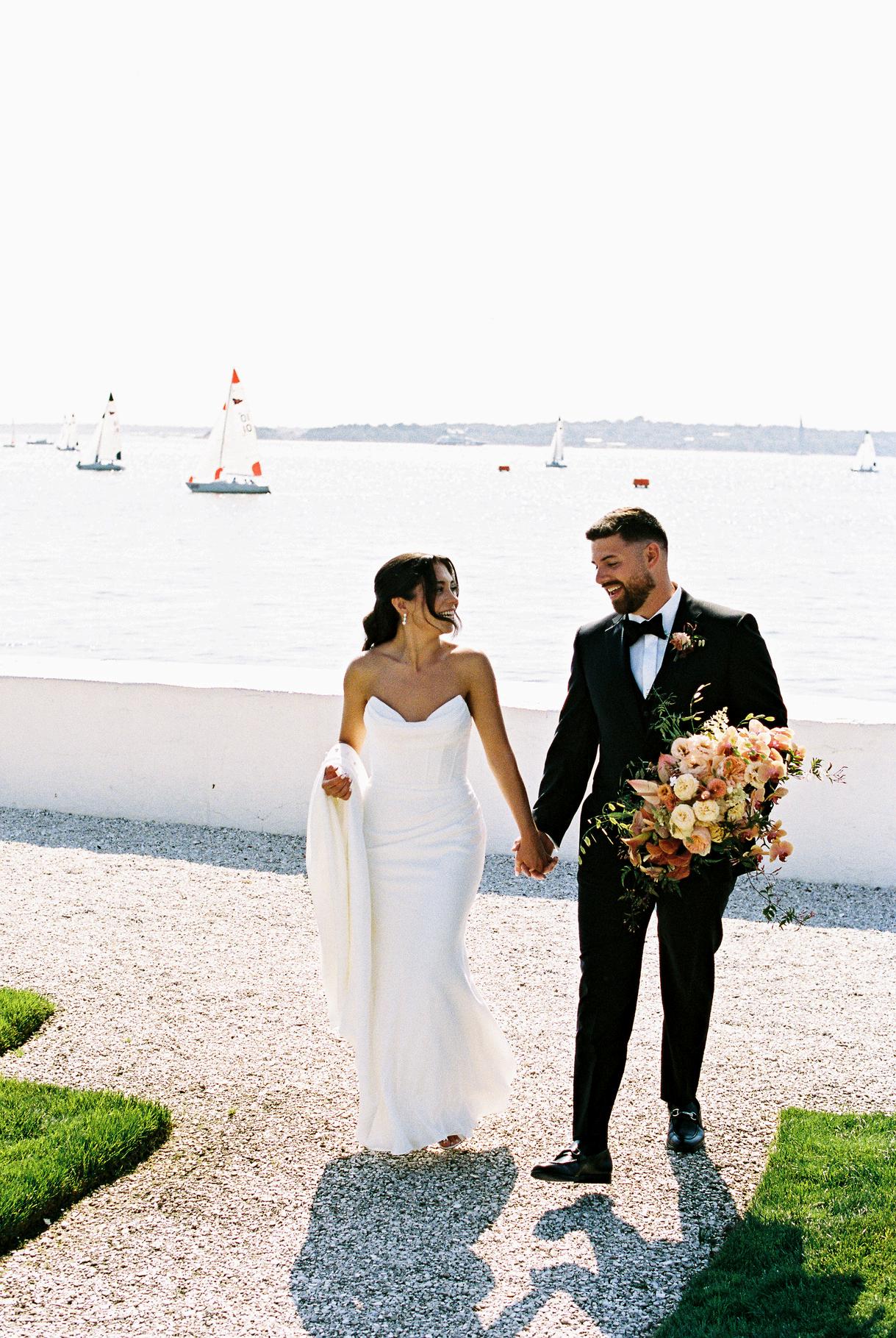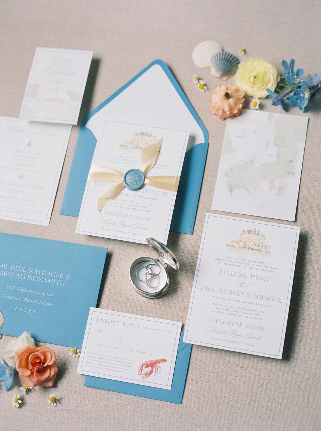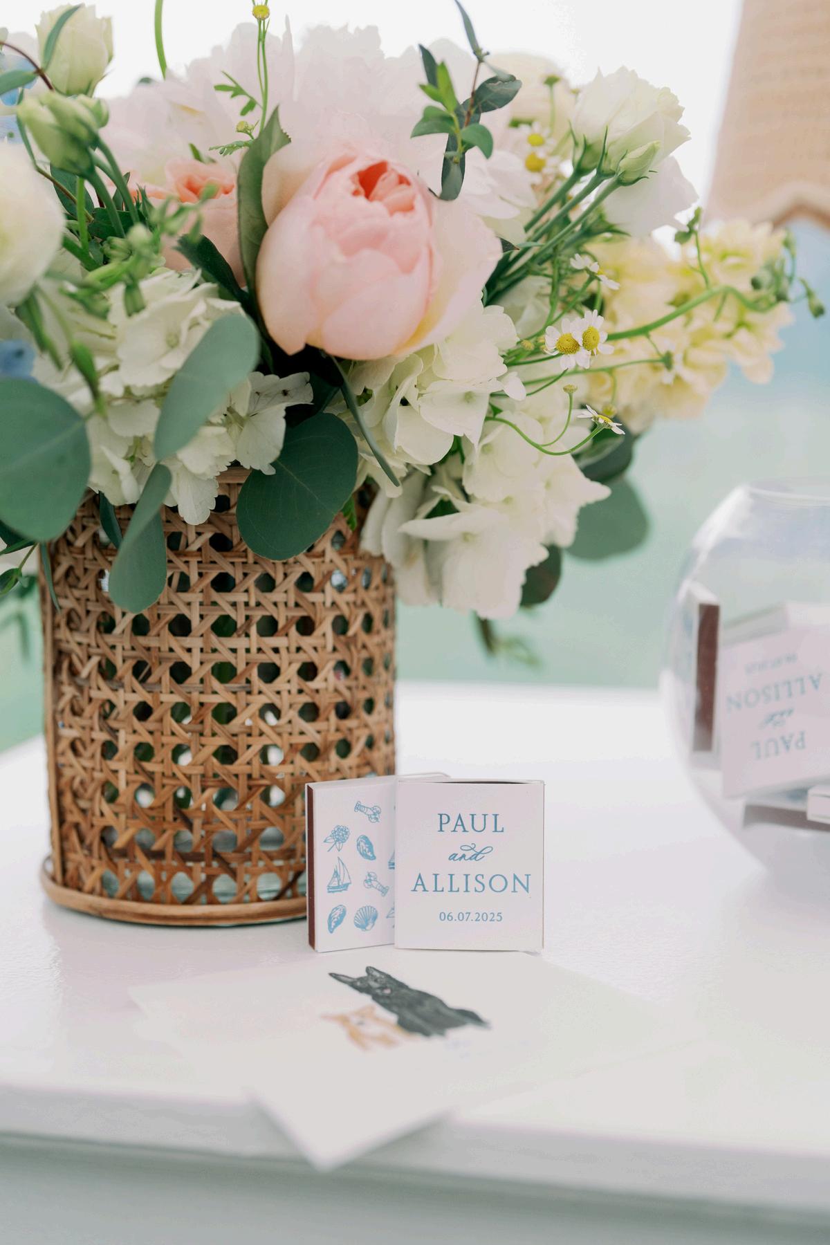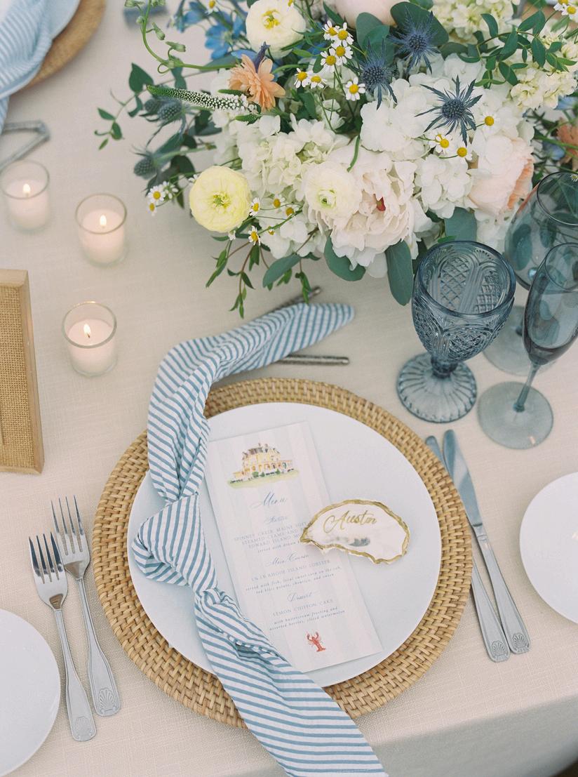 Paul and Allison’s clambake wedding was our most detail-driven celebration of the year, layered with classic coastal elements and thoughtful custom touches throughout Rattan textures were paired with hand-painted watercolor illustrations of iconic New England lighthouses by Kayleigh Frances Art The overall vision felt like an upscale picnic, elevated in every possible way, resulting in a celebration that was both relaxed and truly striking Planning by Something Planned RI, with florals by The Secret Garden and photos by Catherine Band