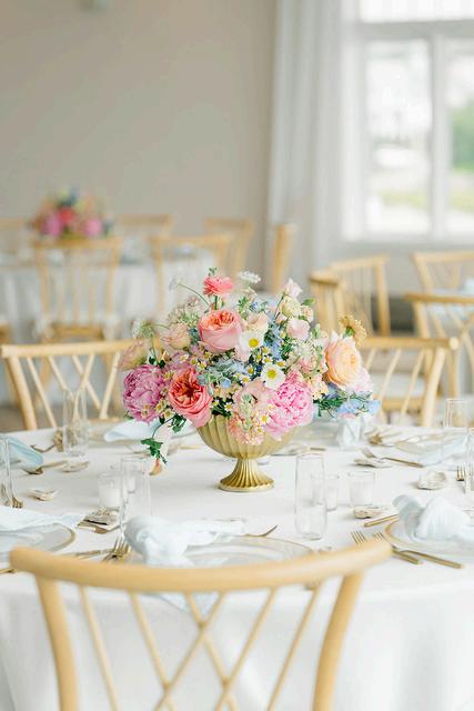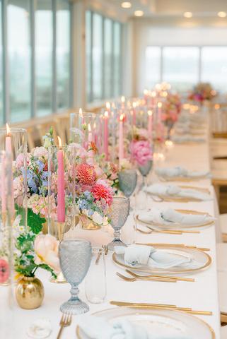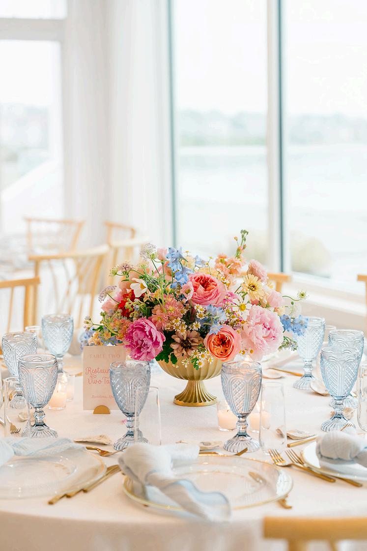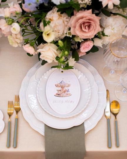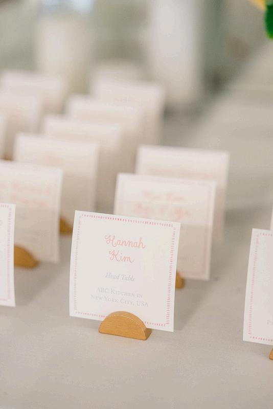 William and Mary’s wedding embraced a bright pastel palette with a playful, whimsical vibe throughout the design One of our favorite moments was the custom round menus placed beneath each charger, allowing guests to catch a glimpse of the menu as they arrived at their seats Rath th t diti l ti h t focal point, we designed classic escort cards featuring a personal twist, with ta e restaurants from their travels around the world Florals by Grace K Photography