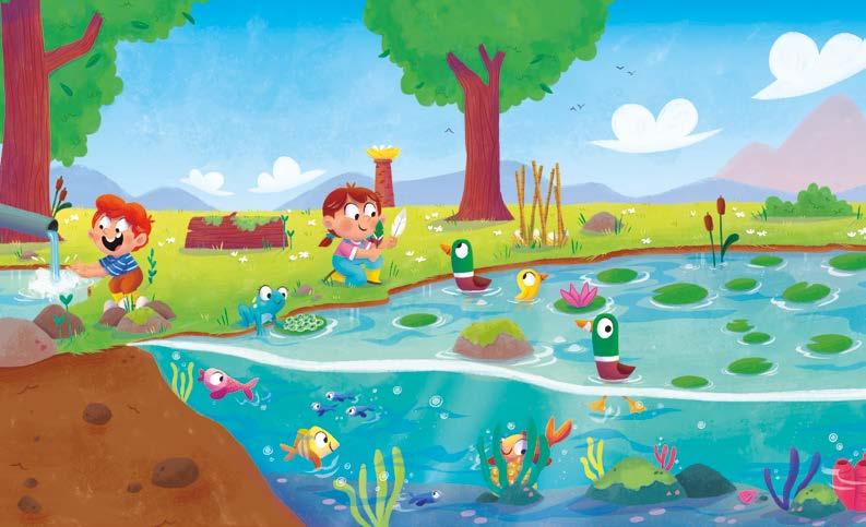 MIENTRAS ANA COMPARA SU PLUMA CON LA DEL PATO, VÍCTOR SE LO PASA EN GRANDE EN UNA FUENTE DE AGUA NATURAL.