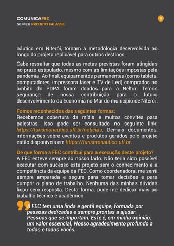 A FEC esteve sempre ao nosso lado. Não teria sido possível executar com sucesso este projeto sem o conhecimento e a competência da equipe da FEC. Como coordenadora, me senti sempre amparada e segura para tomar decisões e para cumprir o plano de trabalho. Nenhuma das minhas dúvidas ficou sem resposta. Desta forma, pude me dedicar mais ao trabalho técnico e acadêmico.