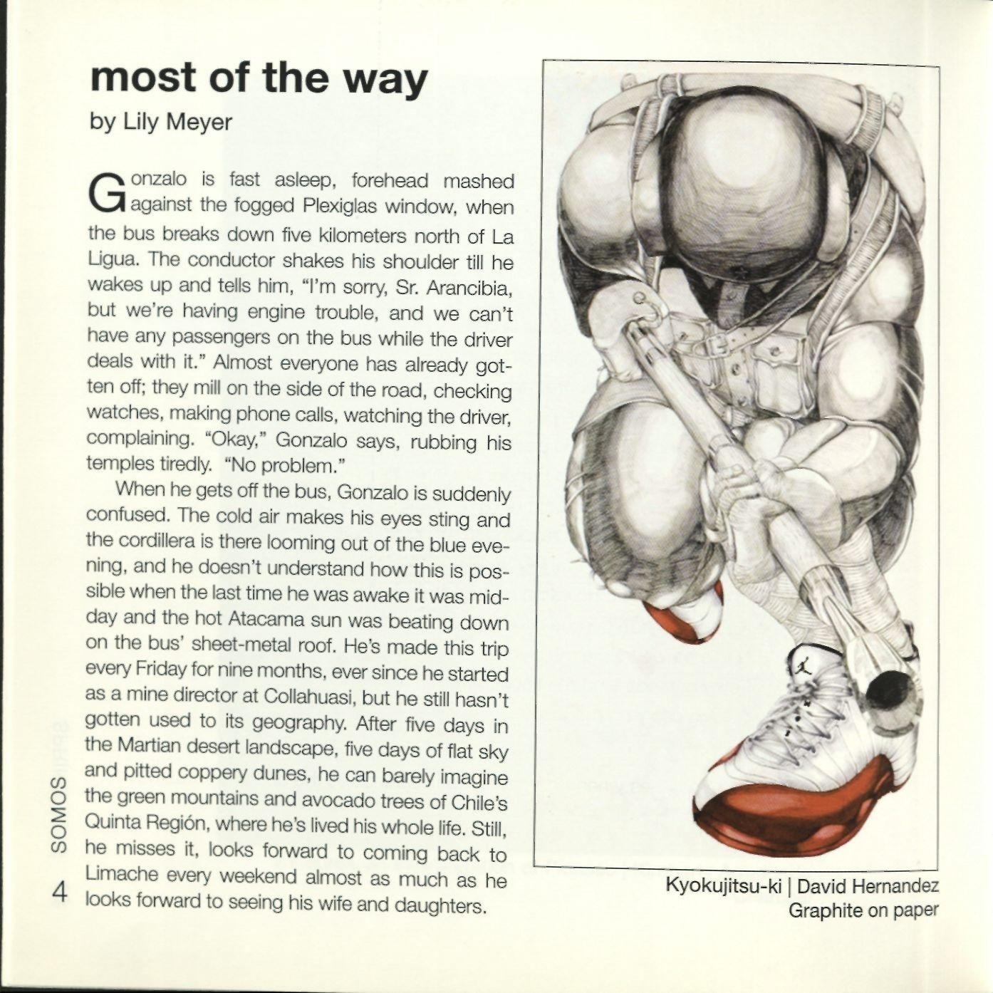 In Lily Meyer's short story "Most of the Way," Gonzalo, a commuter from Limache, Chile, contemplates the youth in Quillota and considers relations with Yesica, a prostitute,while he waitsfor the bus home. Alejandra Ceja writes about self-image and social stigma in a society that privileges a particular, put-together image. She examines "Social Capital" as she comparesherself to a girl whosehair is "light, soft, and TV-commercial shiny."