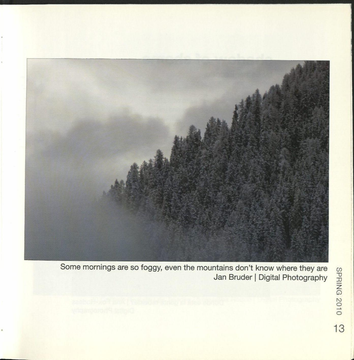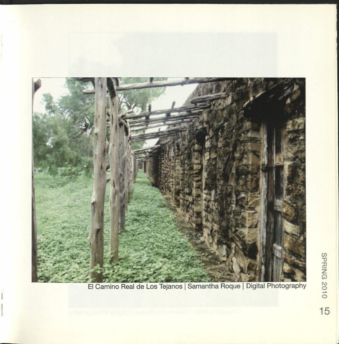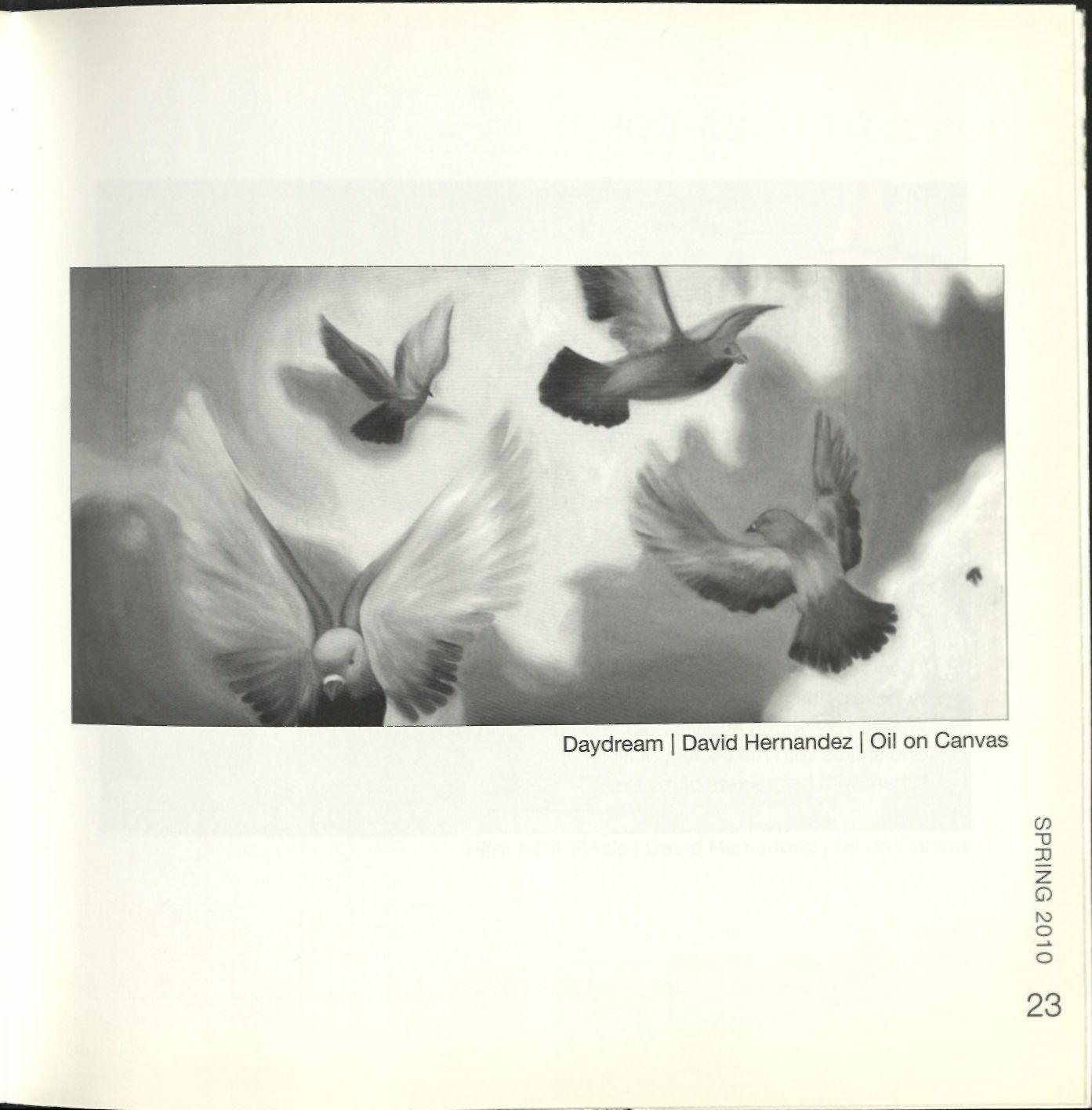 2 2 Figures, an Interpretation of Picasso, Kimberly Arredondo '11 4 Kyokujitsu-ki, David Hernandez '11 8 Del maguay, Samantha Roque'10 11 Memorial a los detenidos desaparecidos de Paine, Ana Fox-Hodess '10 13 Some mornings are so foggy, even the mountains don't know where theyare, Jan Bruder '10 14 Donde esta lagente rebelde?, Ana FoxHodess '10 15 El camino real de los tejanos, Samantha Roque '10 16 Chiapan Lullaby, Samantha Roque '10 23 Daydream, David Hernandez '11 25 1992 NBA Finals, David Hernandez '11 27 El sueno (Memorial a VioletaParra), Ana Fox-Hodess '10