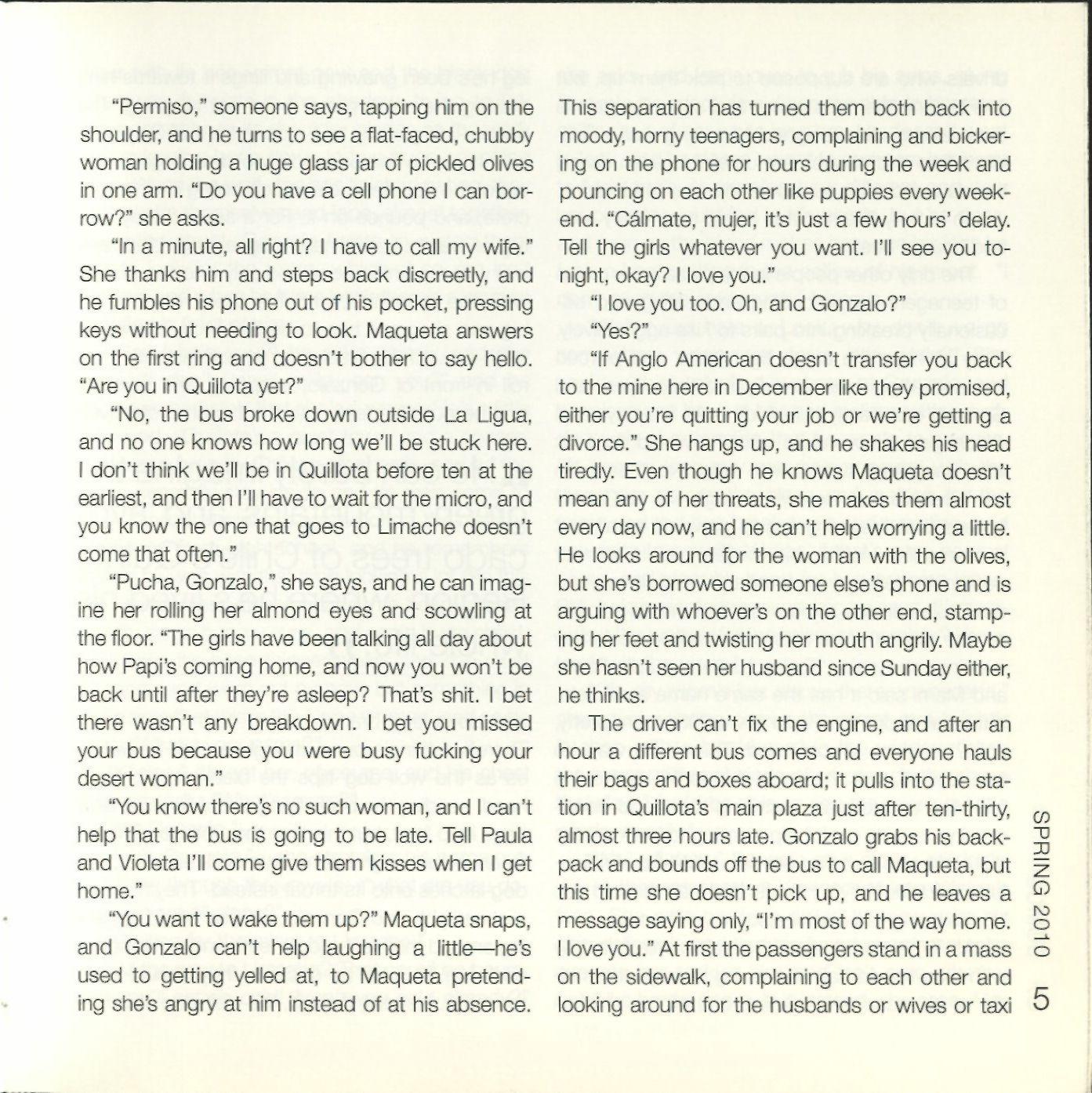 "Pucha, Gonzalo," she says,and hecan imagine her rolling her almond eyes and scowling at the floor. "The girls havebeen talkingall day about how Papi's coming home, and now you won't be back until after they're asleep? That's shit. I bet there wasn't any breakdown. I bet you missed your bus because you were busy fucking your desert woman."