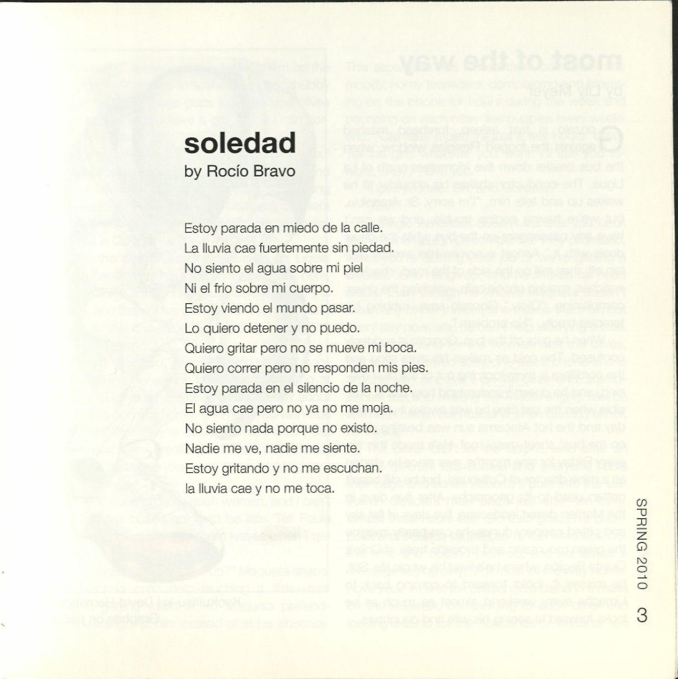 3 Soledad, Rocio Bravo '10 4 Most of the Way, Lily Meyer'13 10 Social Capital, Alejandra Ceja '12 12 Winter Out, Ayoosh Pareek '12 14 Shadow of Shame, Esther Escotto 17 Ya no queda nada, Juan Ruiz '12 18 A las horas del agua, Sara Mann'10 20 Tus manos, Rocio Bravo '10 22 Sin Ti, Rocio Bravo '10 24 I Heard the Ocean Call My Name, Margie Lane 26 Las Paraguas Del Mar, Sara Mann'10