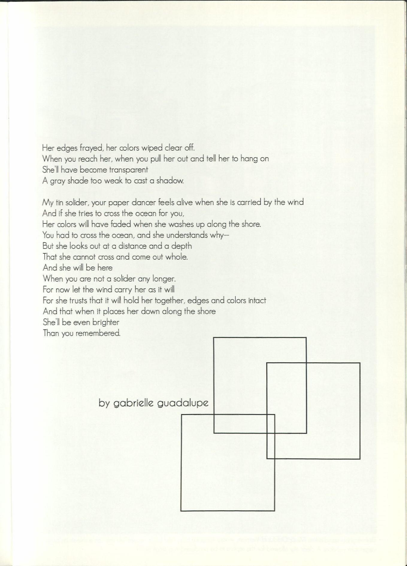 My tin solider, your paper dancer feels alive when she is carried by the wind And if she tries to cross the ocean for you, Her colors will have faded when she washes up along the shore. You had to cross the ocean, and she understands why— But she looks out at a distance and a depth That she cannot cross and come out whole. And she will be here