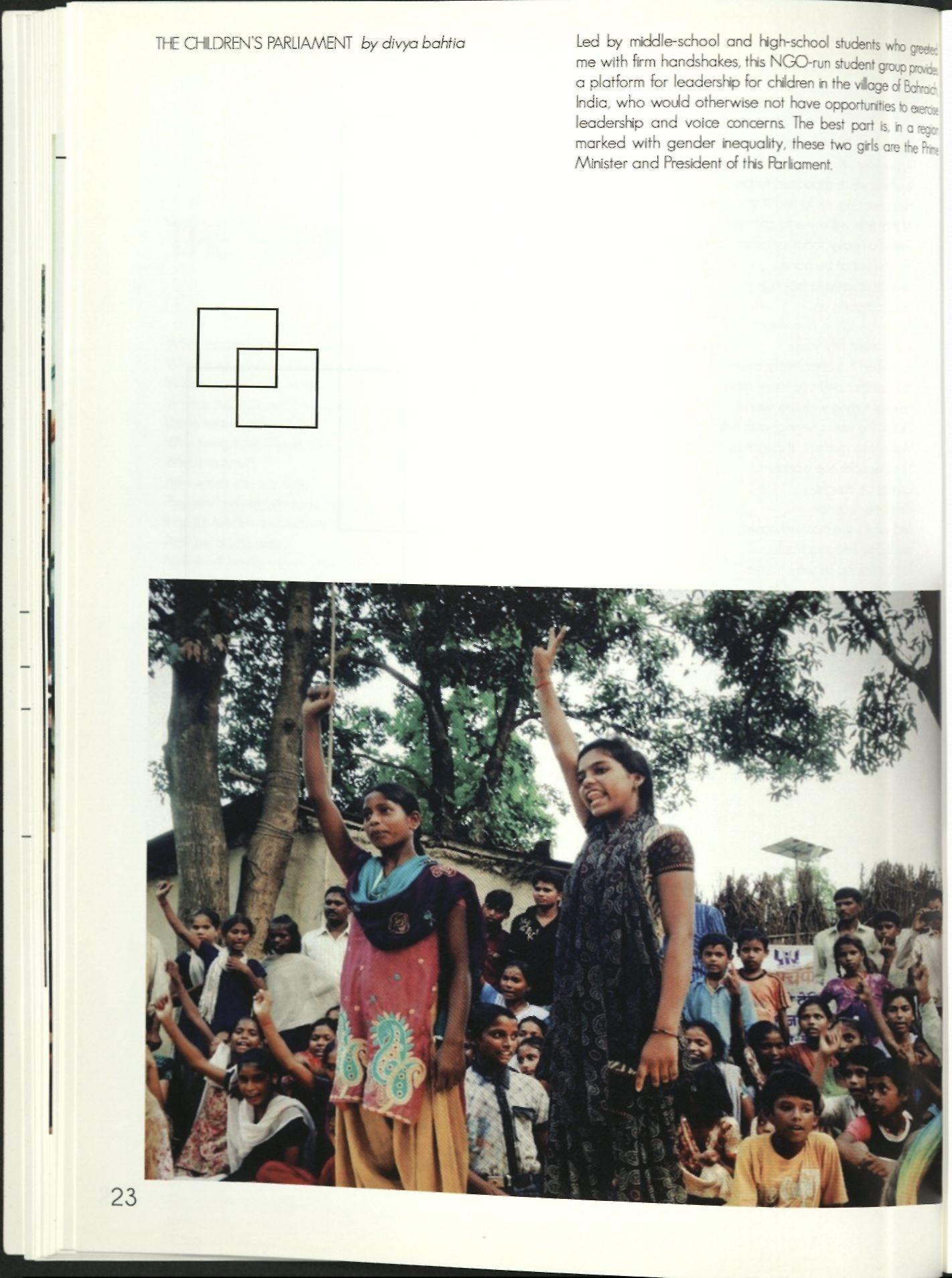 Led by middle-school and high-school students who greet: me with firm handshakes, this NGO-run student group provid=a platform for leadership for children in the village of Bahrc India, who would otherwise not have opportunities to exercise leadership and voice concerns The best part is, in a regiemarked with gender inequality, these two girls are the fare Minister and President of this Parliament.