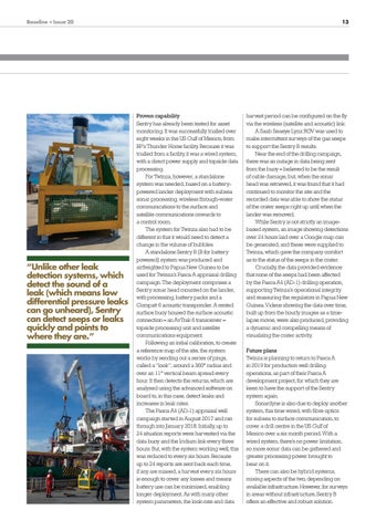 harvest period can be configured on the fly via the wireless (satellite and acoustic) link. A Saab Seaeye Lynx ROV was used to make intermittent surveys of the gas seeps to support the Sentry B results. Near the end of the drilling campaign, there was an outage in data being sent from the buoy – believed to be the result of cable damage, but, when the sonar head was retrieved, it was found that it had continued to monitor the site and the recorded data was able to show the status of the crater seeps right up until when the lander was removed. While Sentry is not strictly an imagebased system, an image showing detections over 24 hours laid over a Google map can be generated, and these were supplied to Twinza, which gave the company comfort as to the status of the seeps in the crater. Crucially, the data provided evidence that none of the seeps had been affected by the Pasca A4 (AD-1) drilling operation, supporting Twinza’s operational integrity and reassuring the regulators in Papua New Guinea. Videos showing the data over time, built up from the hourly images as a timelapse movie, were also produced, providing a dynamic and compelling means of visualising the crater activity. Future plans Twinza is planning to return to Pasca A in 2019 for production well drilling operations, as part of their Pasca A development project, for which they are keen to have the support of the Sentry system again. Sonardyne is also due to deploy another system, this time wired, with fibre optics for subsea to surface communication, to cover a drill centre in the US Gulf of Mexico over a six month period. With a wired system, there’s no power limitation, so more sonar data can be gathered and greater processing power brought to bear on it. There can also be hybrid systems, mixing aspects of the two, depending on available infrastructure. However, for surveys in areas without infrastructure, Sentry B offers an effective and robust solution.