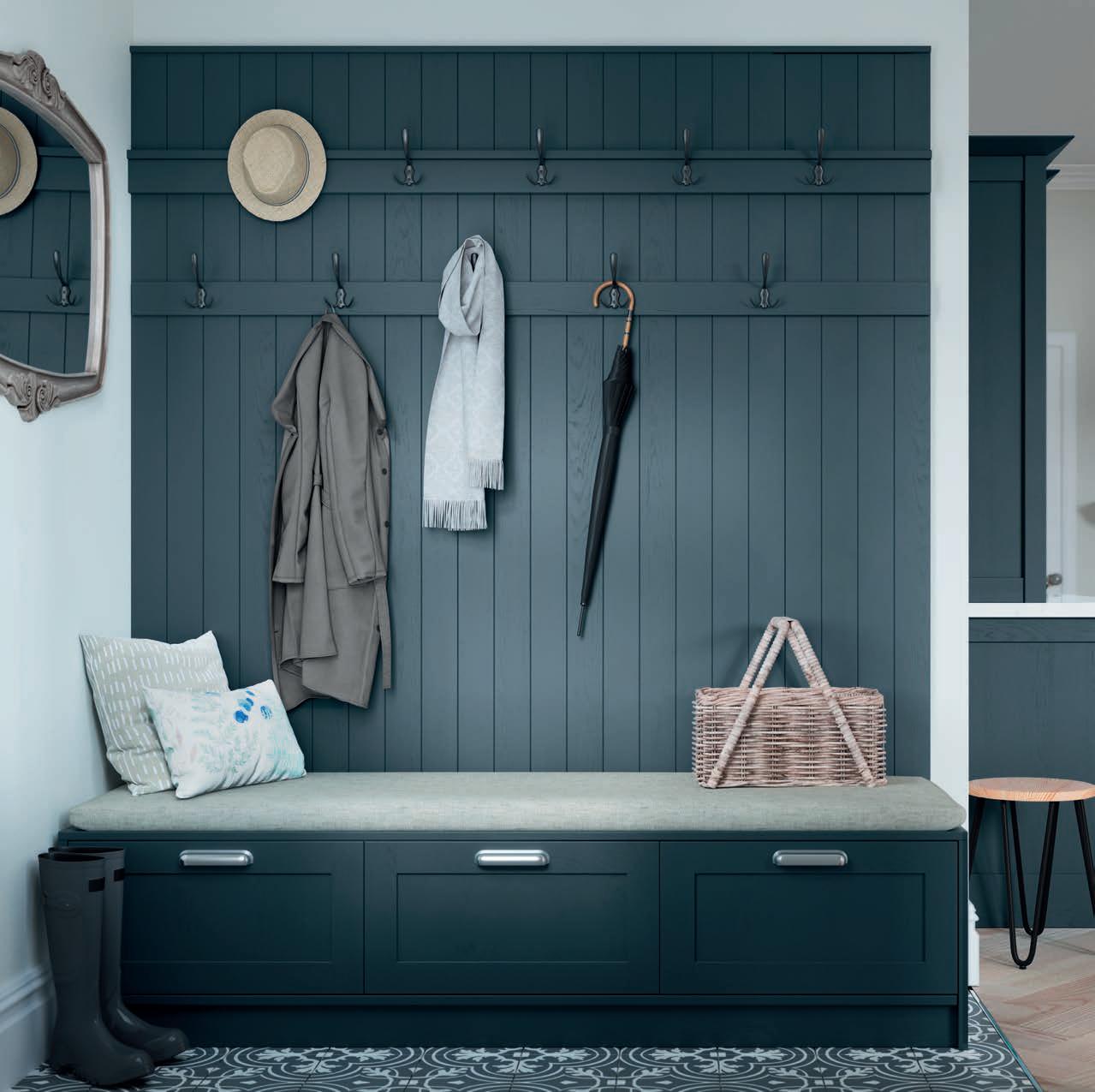 3 Adjoining bootroom area in statement Slate Blue featuring a combination of triple panel doors and top box doors for extra height. Beaded panelling creates a traditional, stylish space for hanging coats and is complemented by solid Oak bench seating.