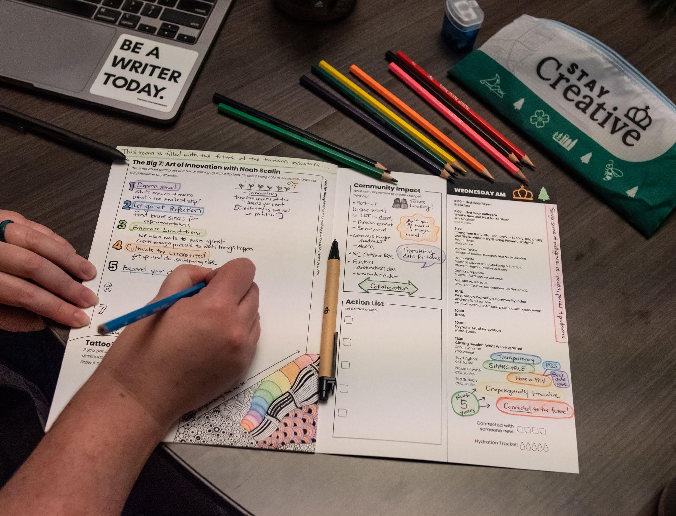 The goal of the 2024 Zarticon was to bring creativity and data research together. One of the ways that we accomplished this was to provide a coloring book/bullet journal style workbook and an art kit to every attendee. On day 1 of the conference, they were greeted with both items sitting on their table. We had one of the first sessions led by our resident visual notetaking expert to inform everyone about the goal of the workbook.