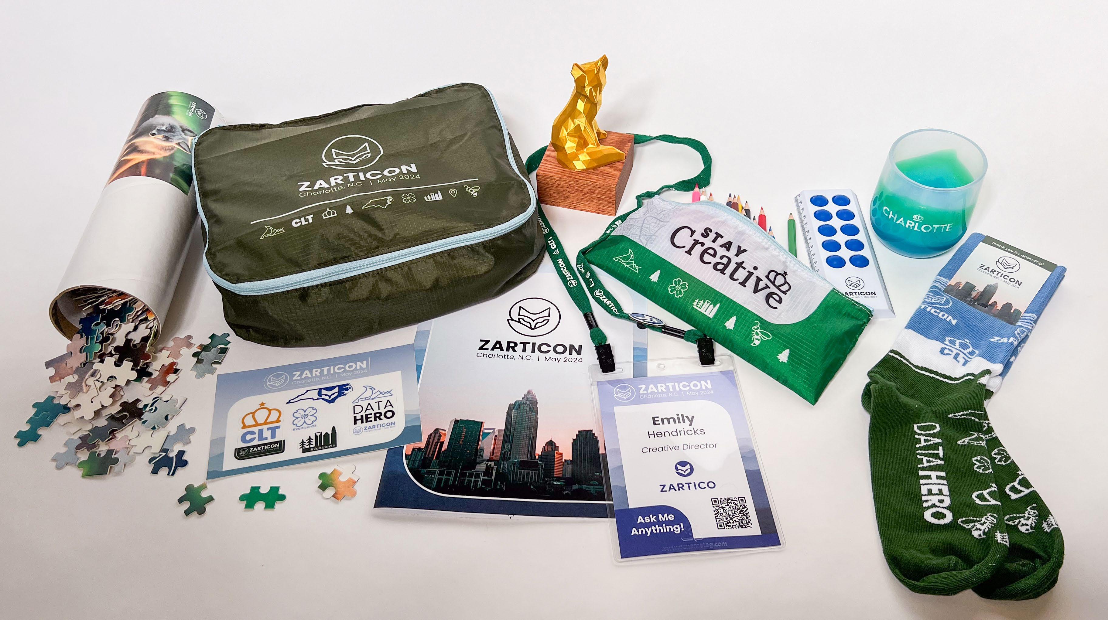 The goal for swag at the 2024 Zarticon event was to continue our delight and uniqueness from the previous year. All attendees received a pair of socks, a sticker sheet, a puzzle, a silicone tumbler, and a full-zip fleece jacket all in a branded packing cube (to continue their collection of packing cubes from the previous year). We used extra puzzles during networking times to have an activity for attendees to do while they were connecting.