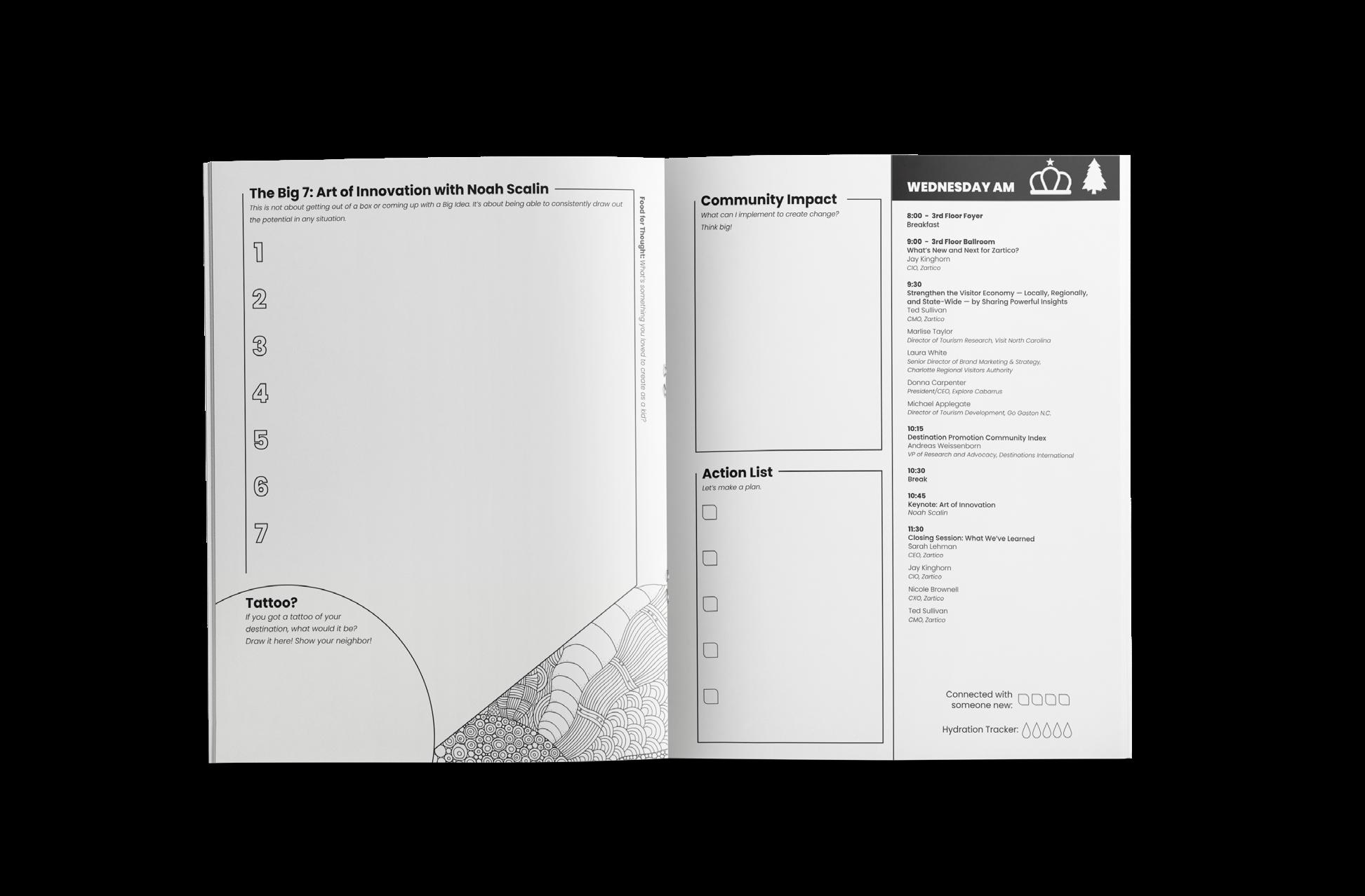 Each spread was broken down by half a day and held prompts around what was being spoken about that day. There were coloring sections to promote doodling, and the back was a full coloring page with the same design as the community art project (more on that later).