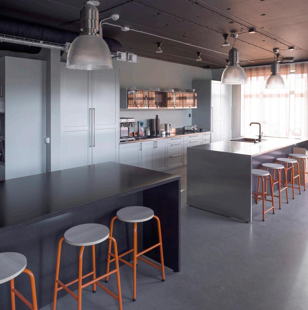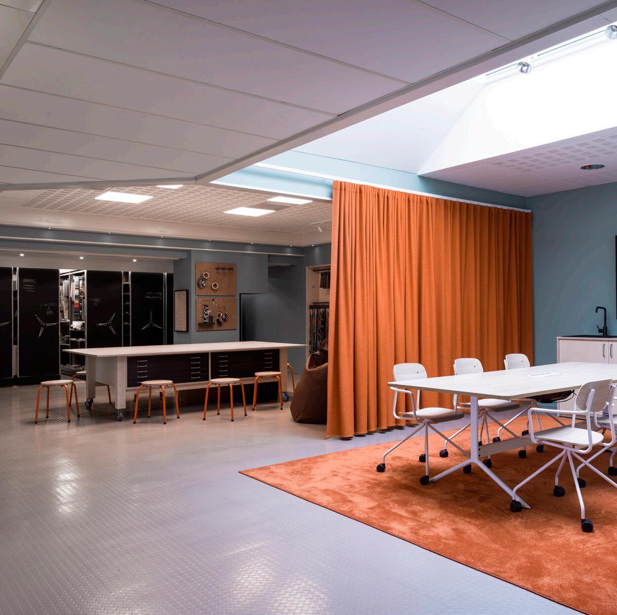 Genomgående i fabriken finns företagets färger på möbler och inredningsdetaljer. En miljö som andas kreativitet och glädje.