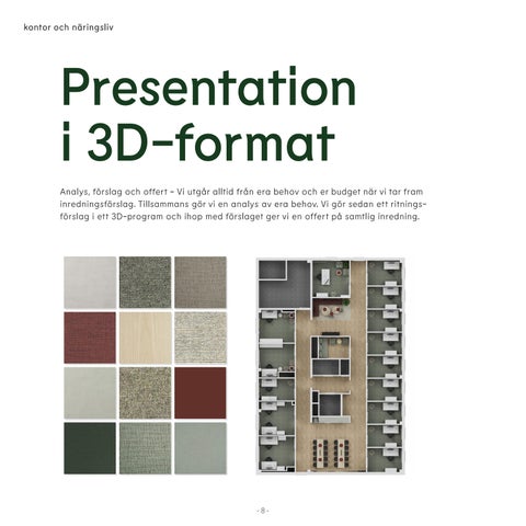 Broschyren visar hur vi arbetar och bearbetar inredning för kontor och näringsliv. Från analys och offert till leverans och efterservice, allt med miljöaspekten i åtanke. Vi ställer höga krav på oss själva och våra samarbetspartners.
