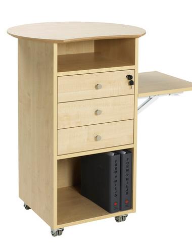Ståpulpet MORA i björklaminat. 2 respektive 3 lådor varav 1 låsbar. 2 öppna fack och 4 låsbara hjul. En variant med klaffskiva till höger.