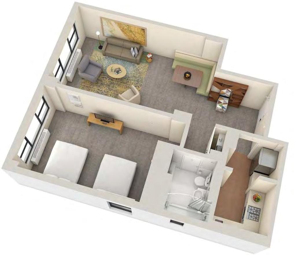 • 3 Two-bedroom apartments, up to 850 sq. ft.