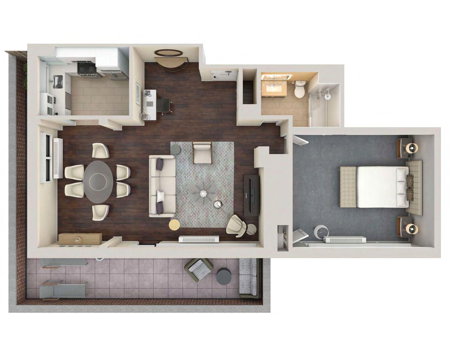 • 9 One-bedroom terrace apartments, up to 650 sq. ft.