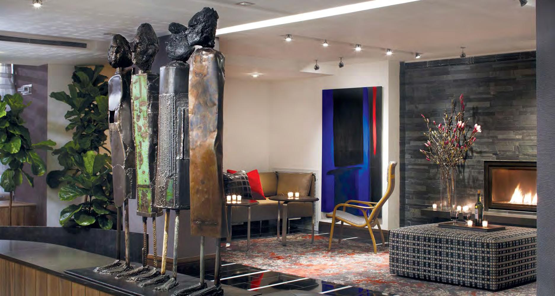 • The Den, a playful and cozy spot with a gas-lit fireplace, vibrant abstract artwork, flat-screen TVs, and shelves stocked with art books and collectibles