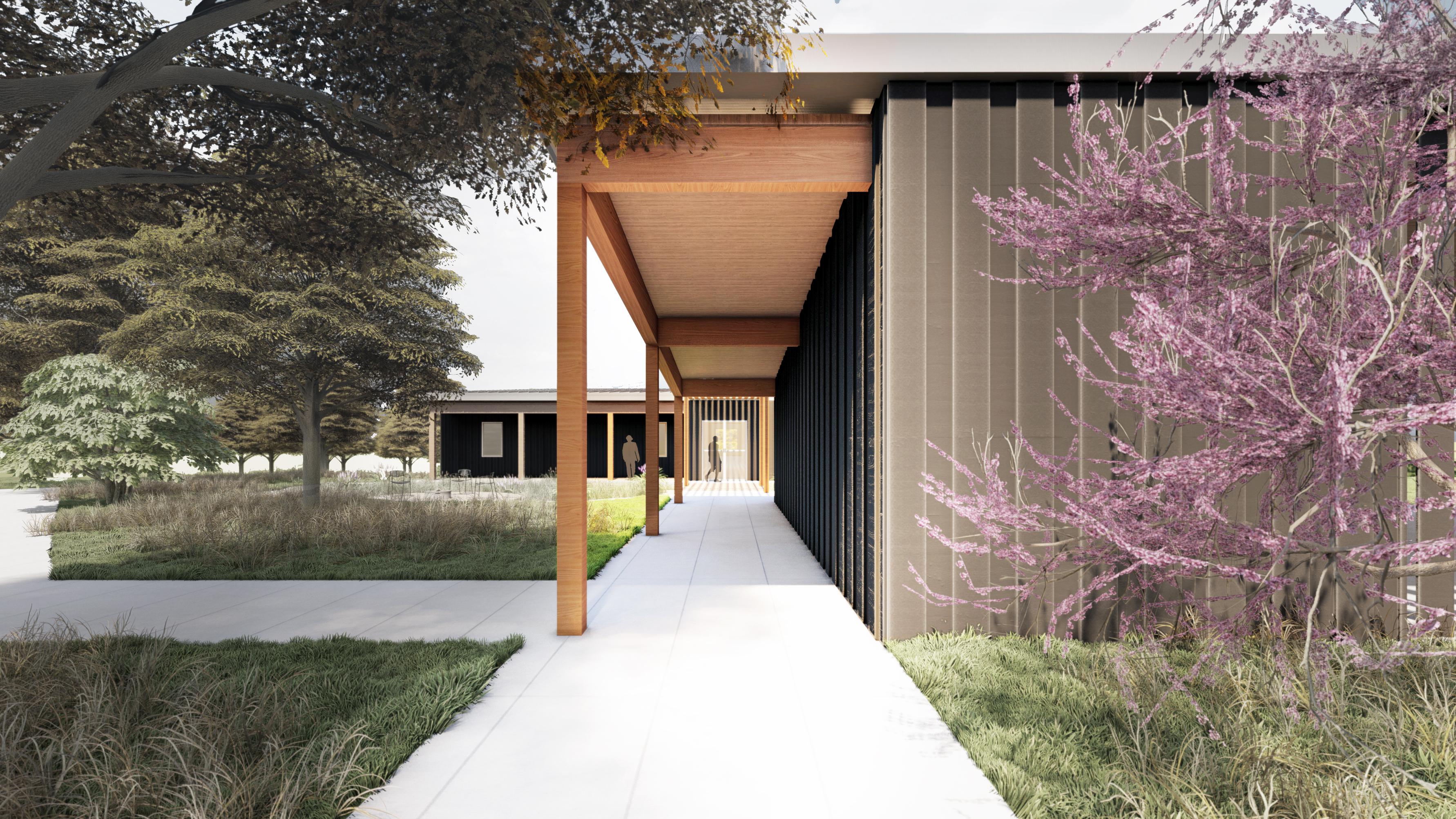 The aim of the new visitor’s center at Indian Cave State Park is to give visitors a glimpse of what lies beyond its walls. To achieve this, the building’s location, choice of materials, and use of native plants in the landscape design were all carefully considered with the goals of encouraging connection through interpretation, feasible design, and a sustainable approach. The project was defined by two main axes: the “Y” axis for the visitor experience and the “X” axis for the built environment. The new center offers a preview of what visitors can expect to see within the park and was built with the interests of park visitors, staff, and natural resources in mind.