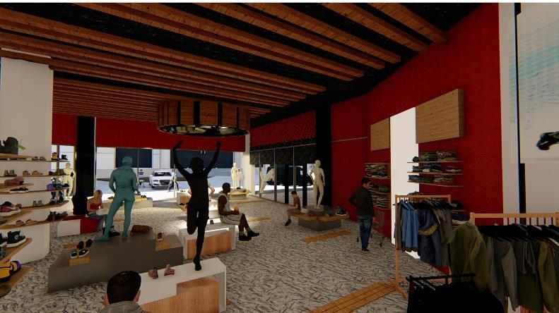 This arcade design emphasizes openness and interaction, creating an airy, inviting space that seamlessly connects two shops. The layout fosters fluid movement and encourages social engagement, blending functionality with aesthetic appeal. The design focuses on enhancing the user experience while maintaining a harmonious relationship between the built environment and its occupants.