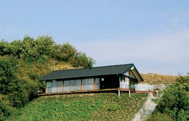 man sig godt tilpas. Stue og spiseplads deles af lav væg og stuens store vinduer er udført som en glasudbygning. Flot køkken med en spændende køkkenø og mange skabe. Virkeligt spændende fritidshus, som vil egne sig perfekt til en udsigtsgrund.