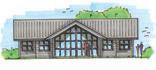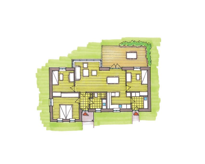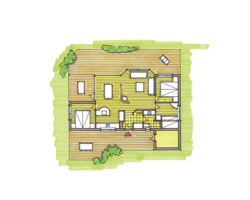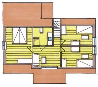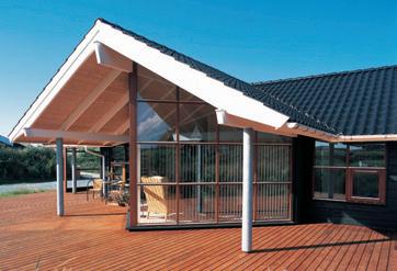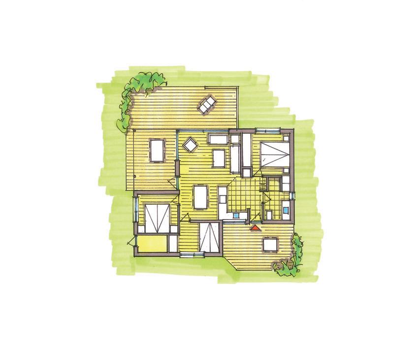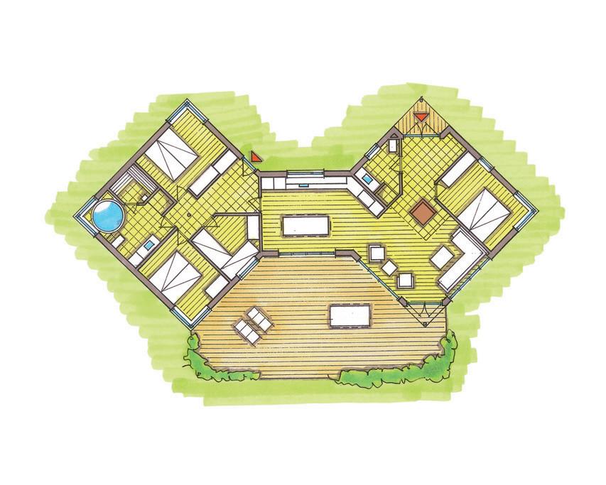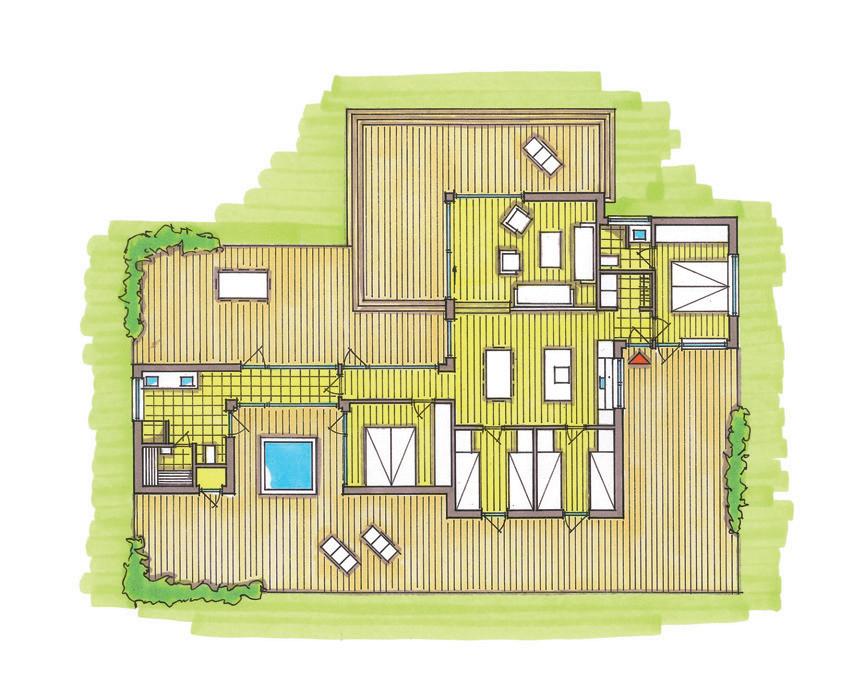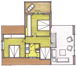 Denne planløsning er den samme som type Diplomat 165 V. Her har vi dog udvidet huset med et ekstra soveværelse med dobbeltseng, således huset har 9 faste sengepladser. Udbygningen med det ekstra værelse giver en større overdækning af en del af sol-