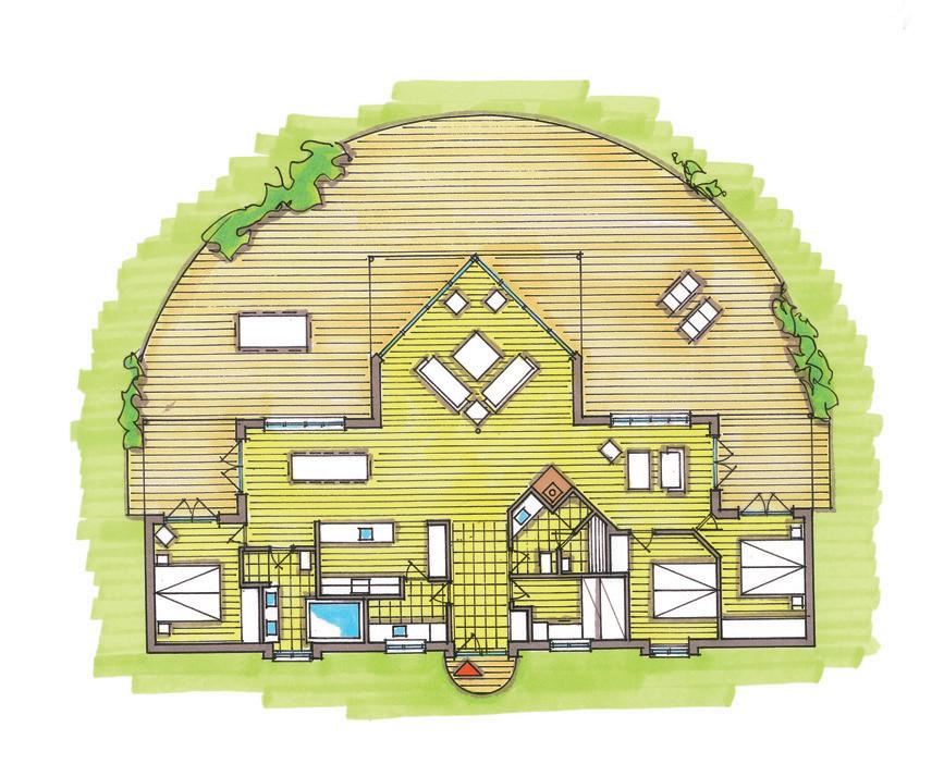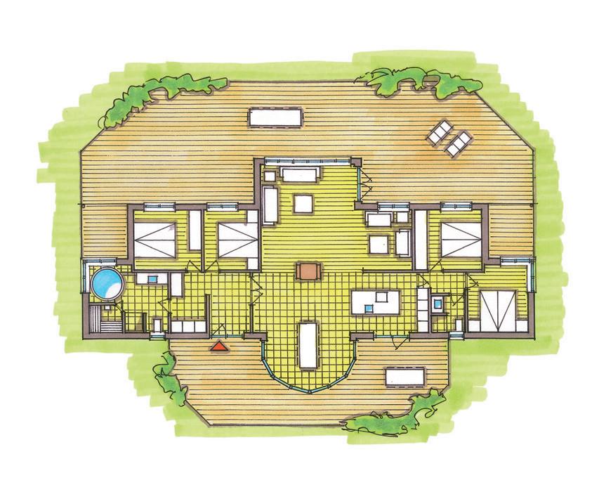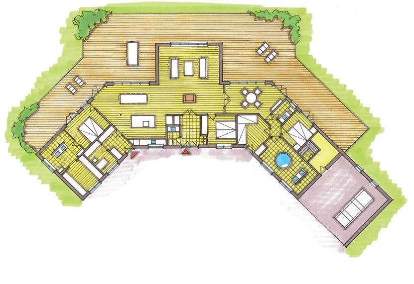 klædeskab og åben garderobe til gæsterne. Fra hallen går man direkte ind i den store og smukke stue med det flotte glasparti mod terrassen. Her er mulighed for at opføre stor, opmuret og vandskuret pejs. Endvidere ekstra stue hvorfra man har adgang til afdeling med et fantastisk wellness-rum indeholdende stort forsænket og indmuret spabad, sauna, flot bordarrangement med 2 vaske og dobbelt bruserum, gæstebad og 2 værelser. I modsat ende