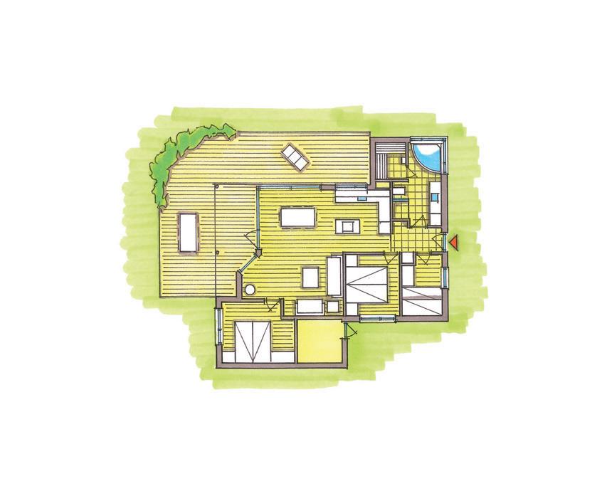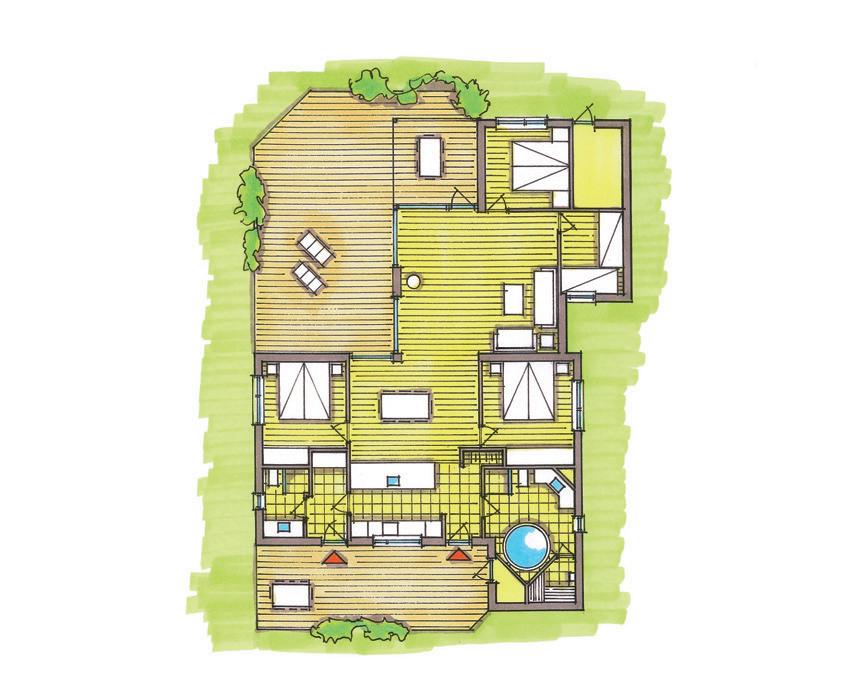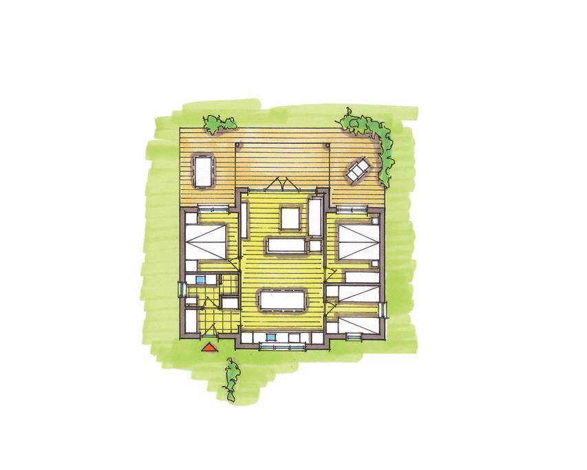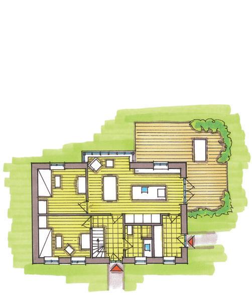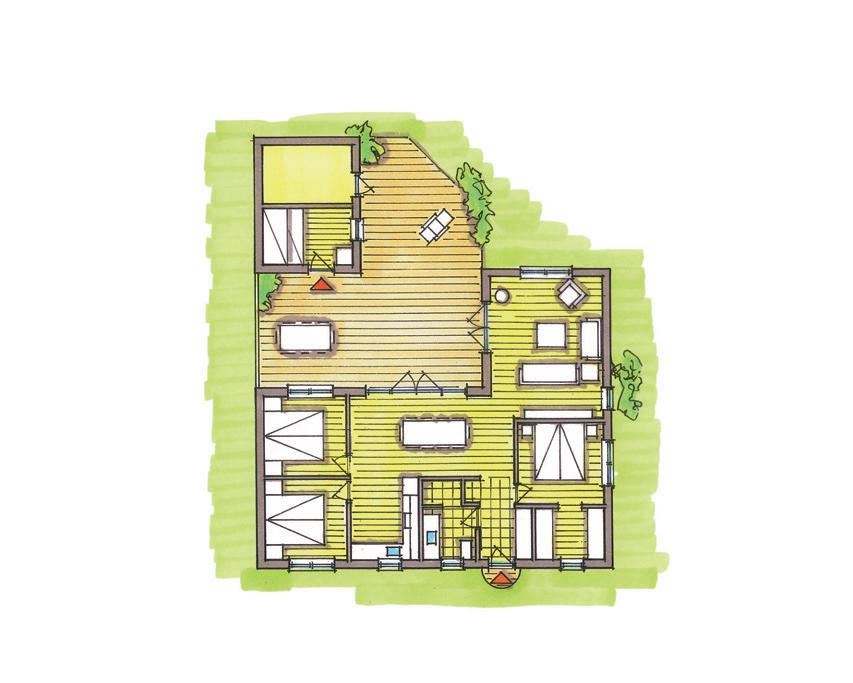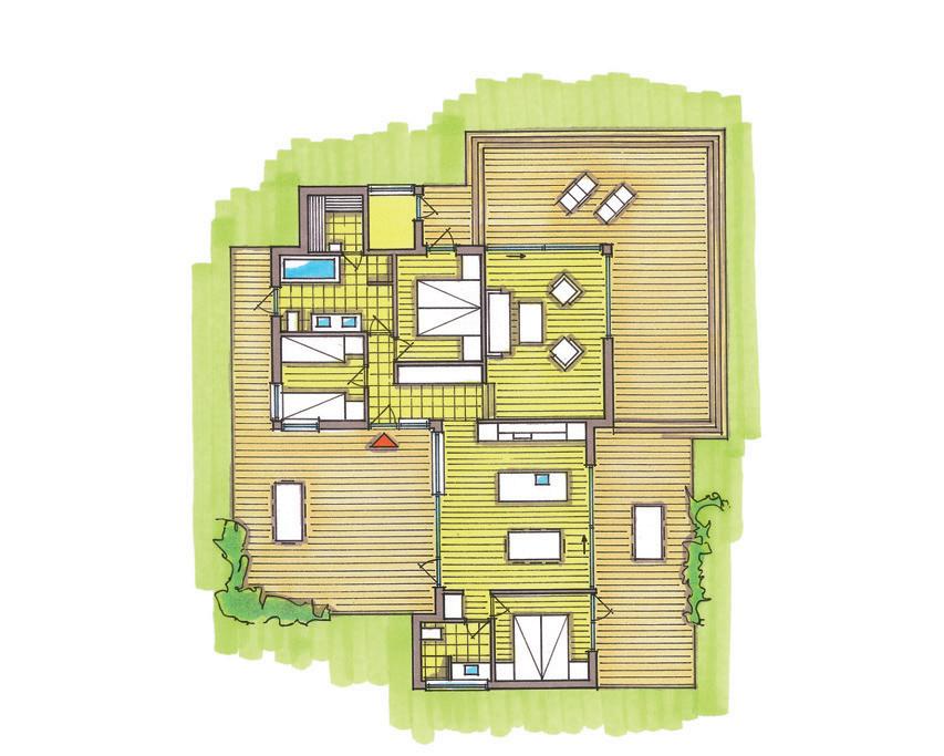 eget bad i den ene del af huset og de øvrige soveværelser med tilhørende lækkert badeværelse med både indmuret spabad og sauna, i den anden del af huset. I øvrigt en dejlig lys entré med stor indbygget skabsvæg. Denne type giver rig mulighed for at placere sol- og læterrasser på flere sider af huset. Et dejligt hus med en god indretning.